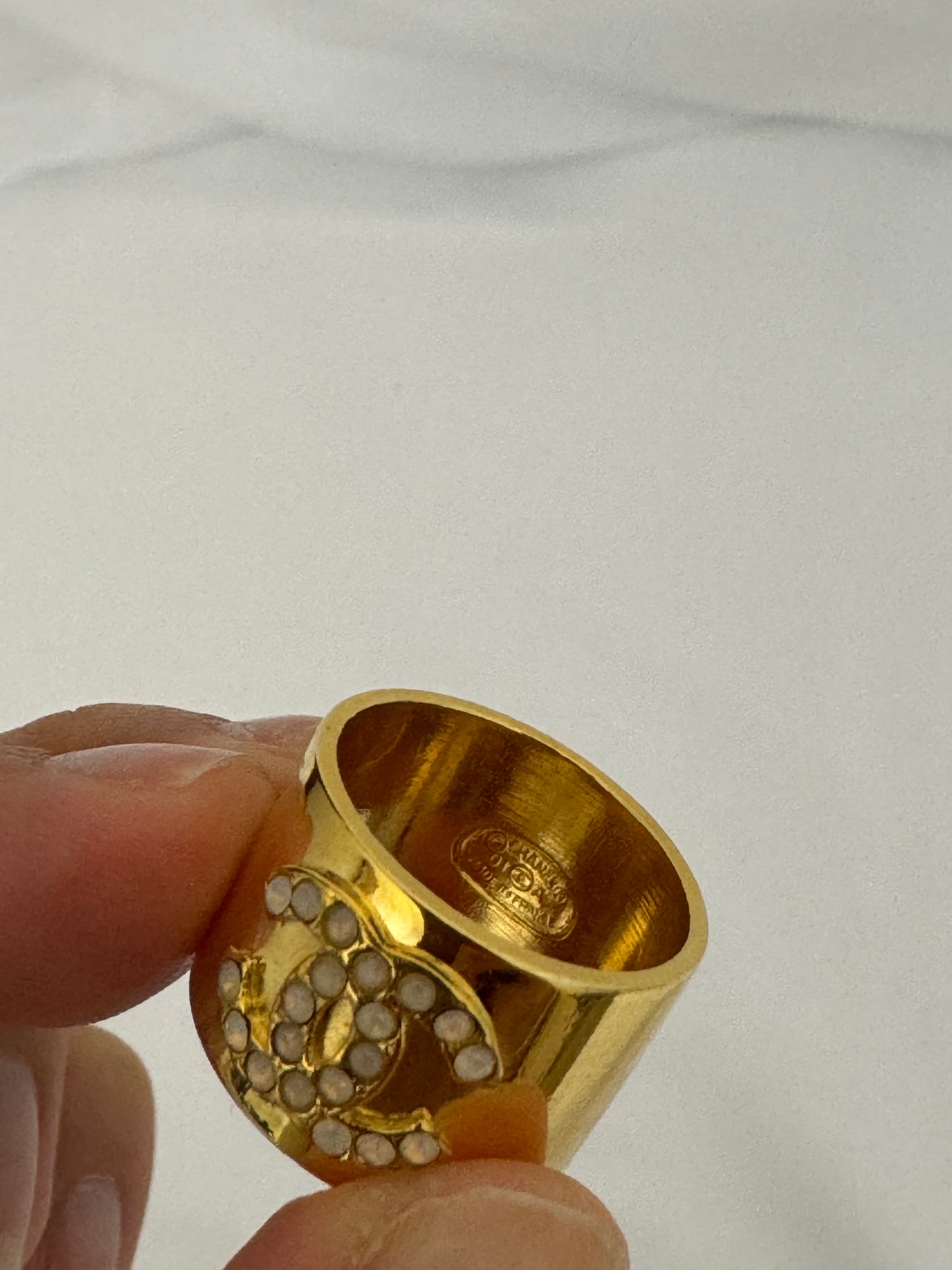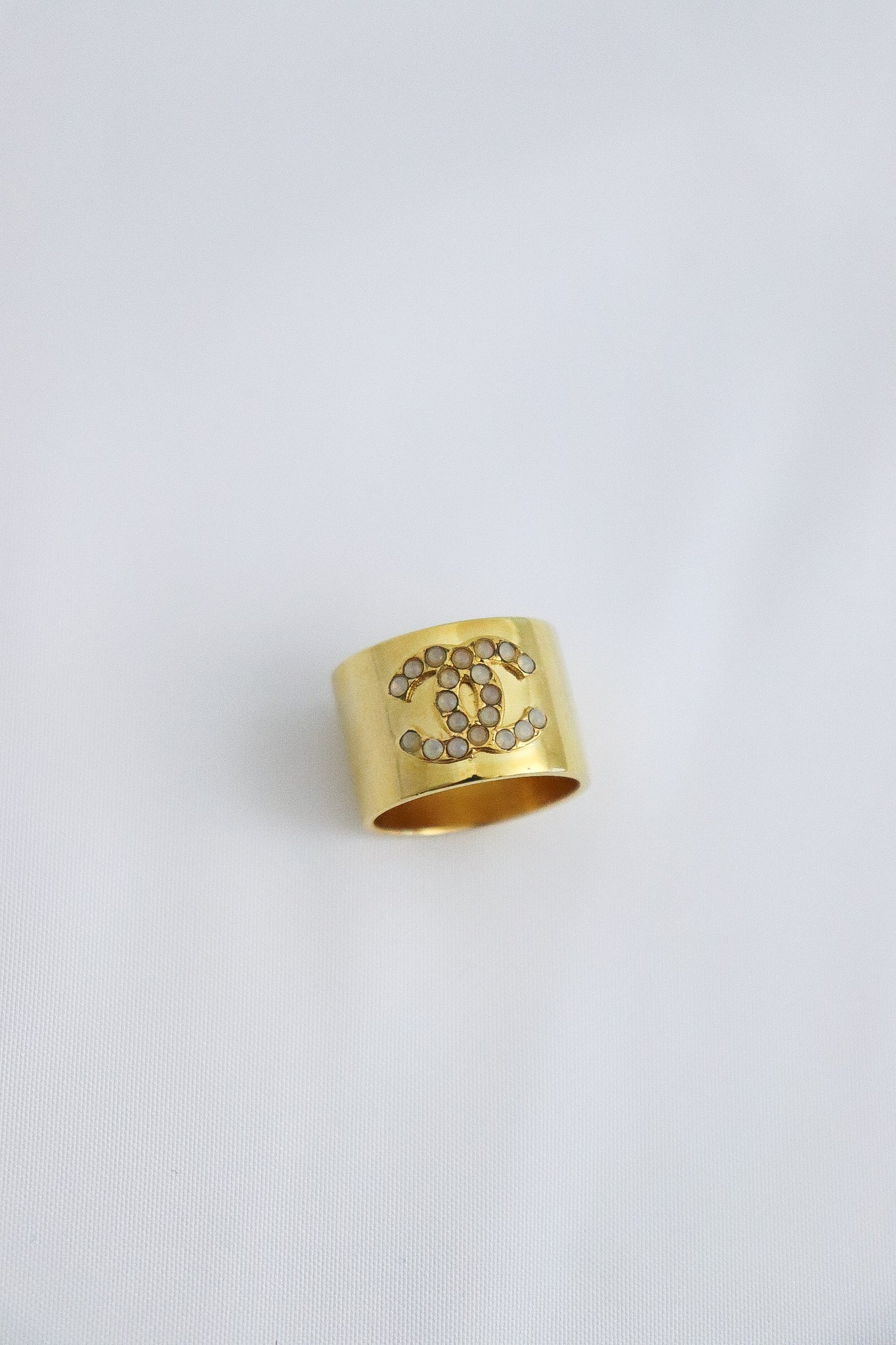 A classic and fabulous thick vintage ring, perfect for any day. Featuring white crystals and CC mark and a stamped signature inside. Made in France, from late 20th century.
