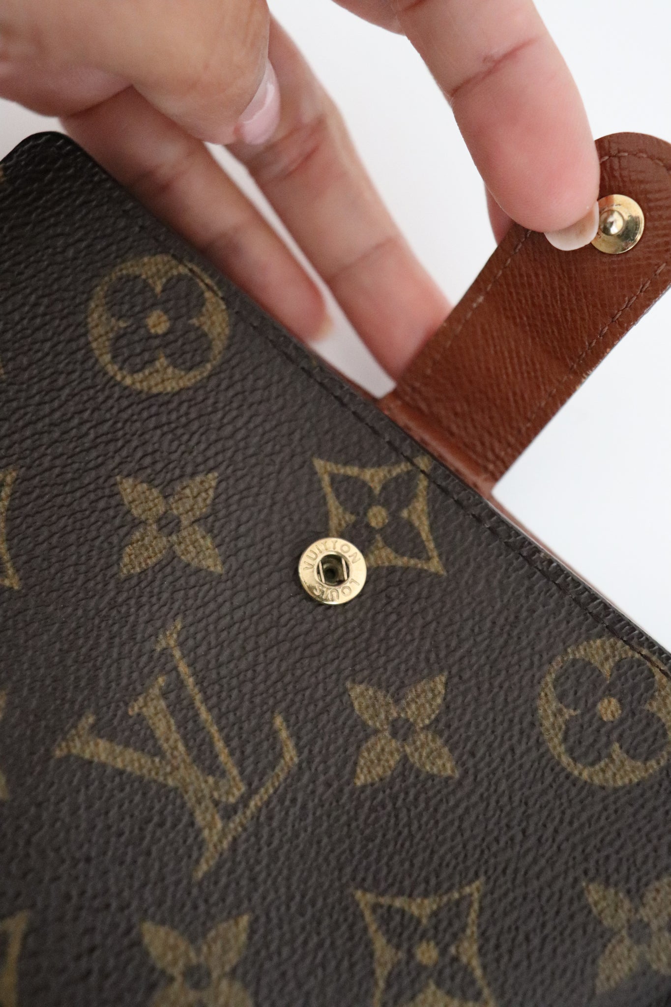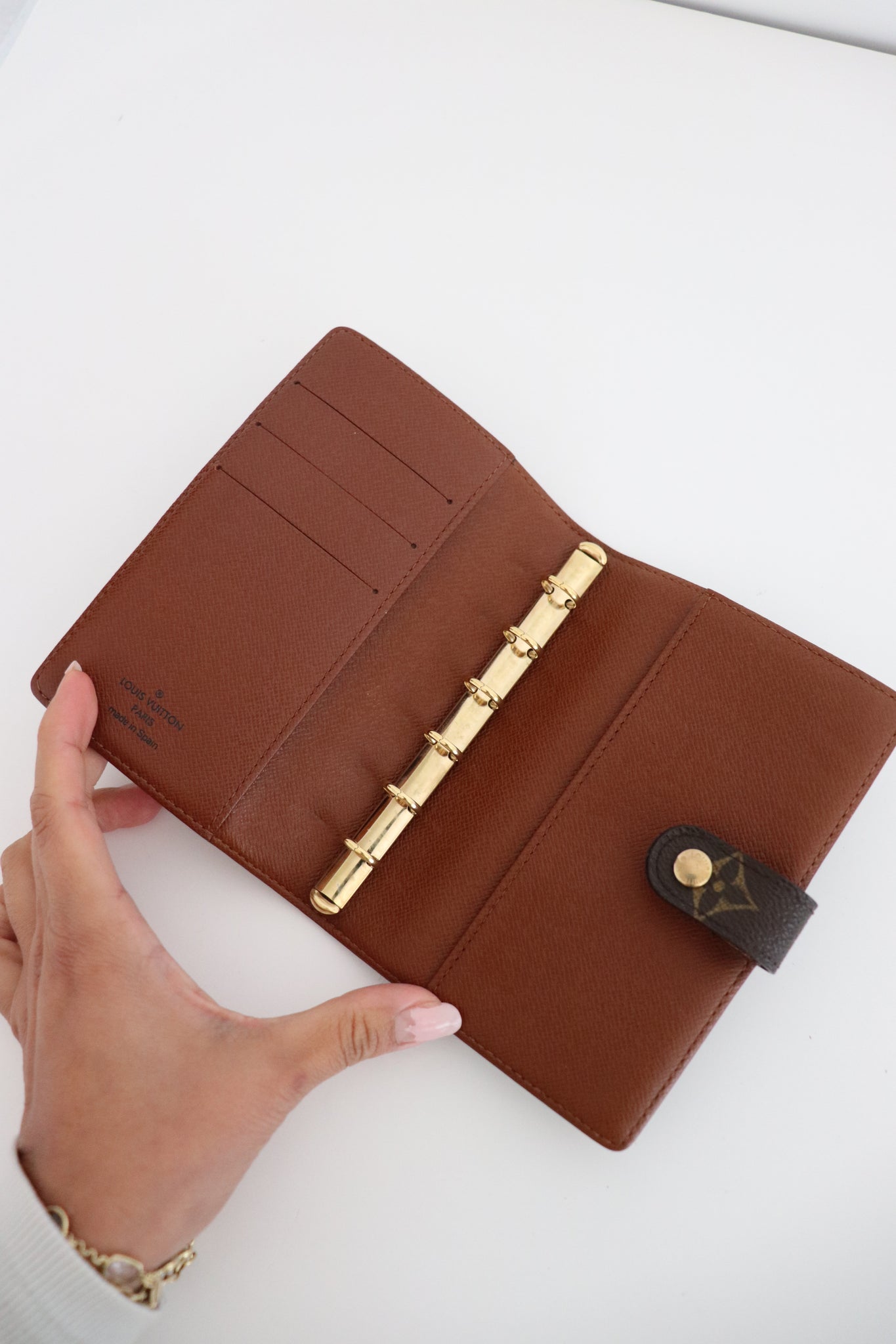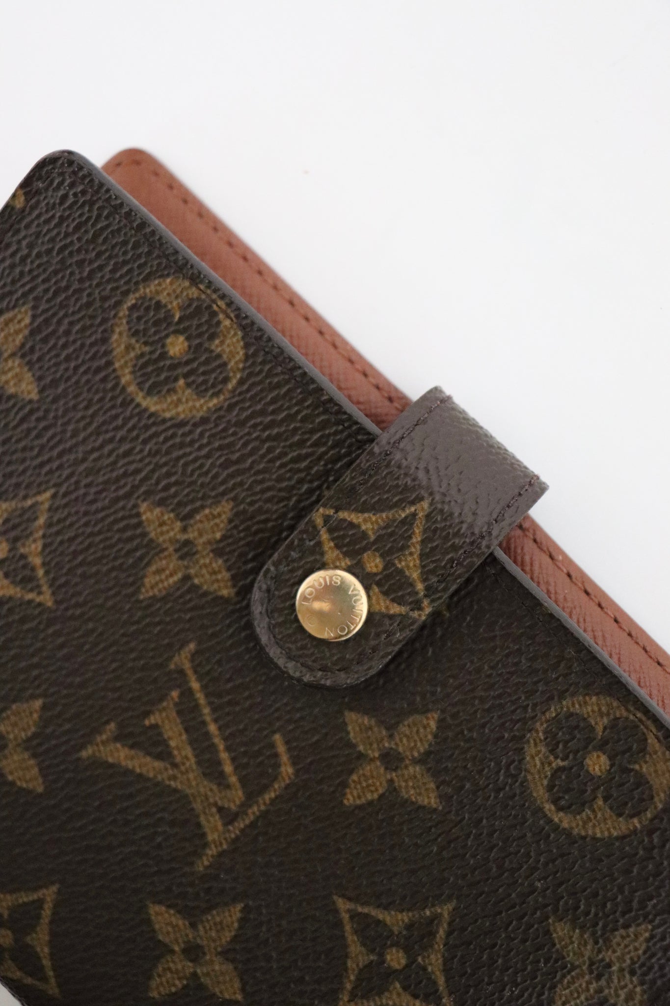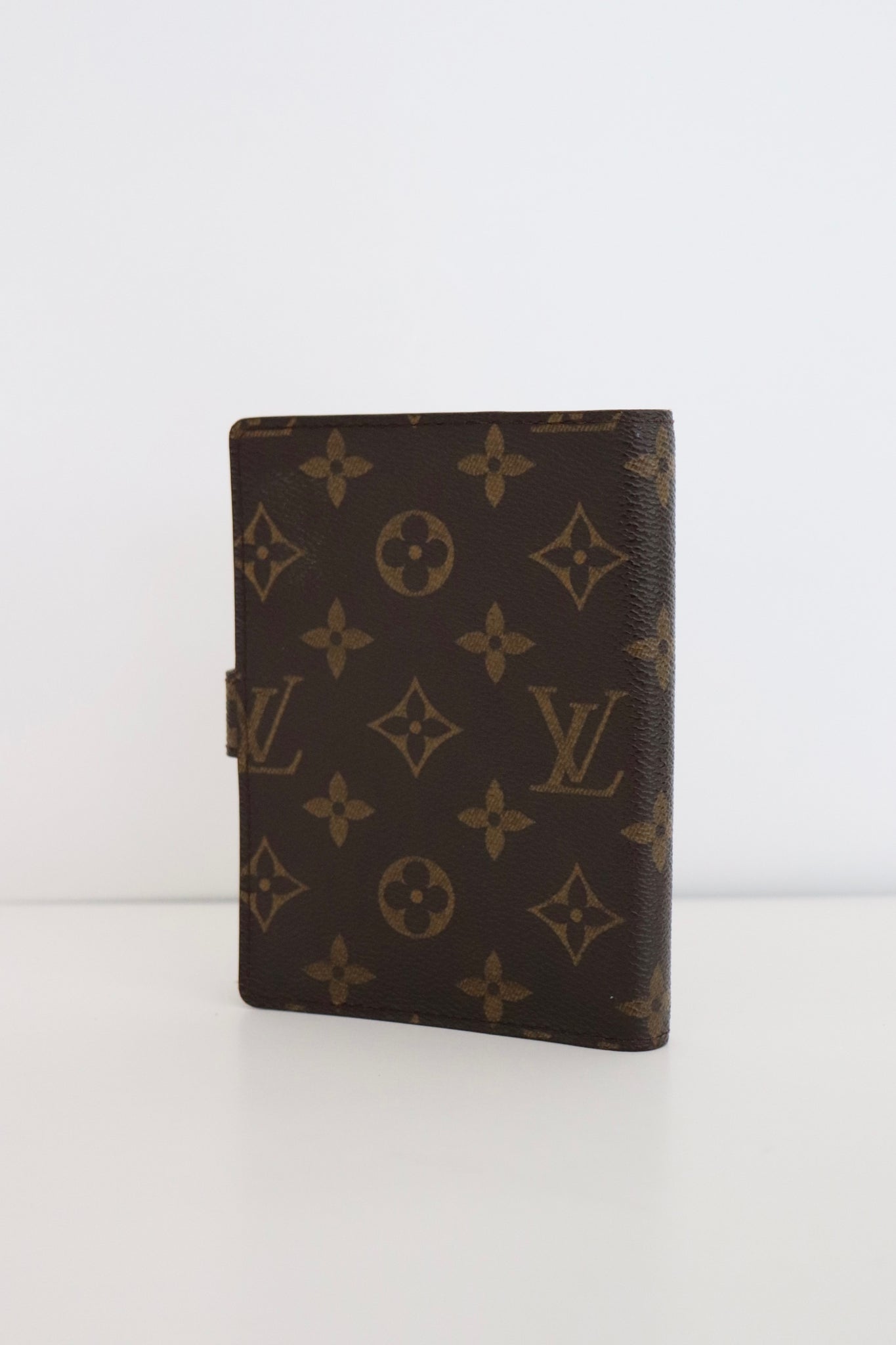 Brown and tan coated canvas Louis Vuitton vintage Monogram small ring agenda cover with gold-tone metal hardware, cross-grain leather interior, dual slit pockets at interior walls, 3 card slots, snap closure at front and brand stamp at interior. From the 1999 collection. Made in Spain. Includes dust bag.