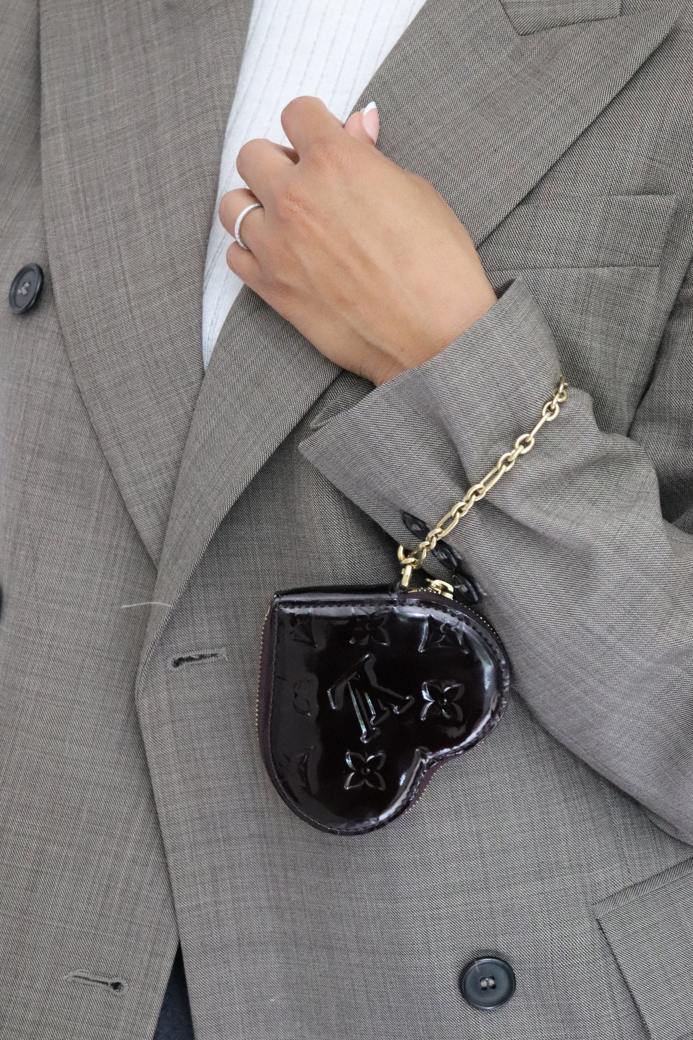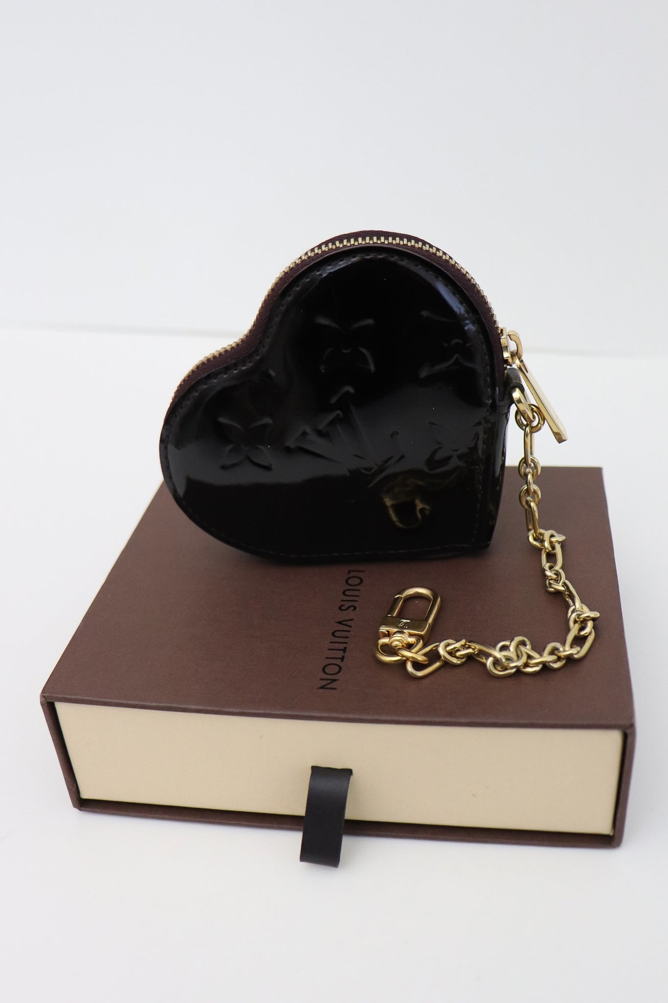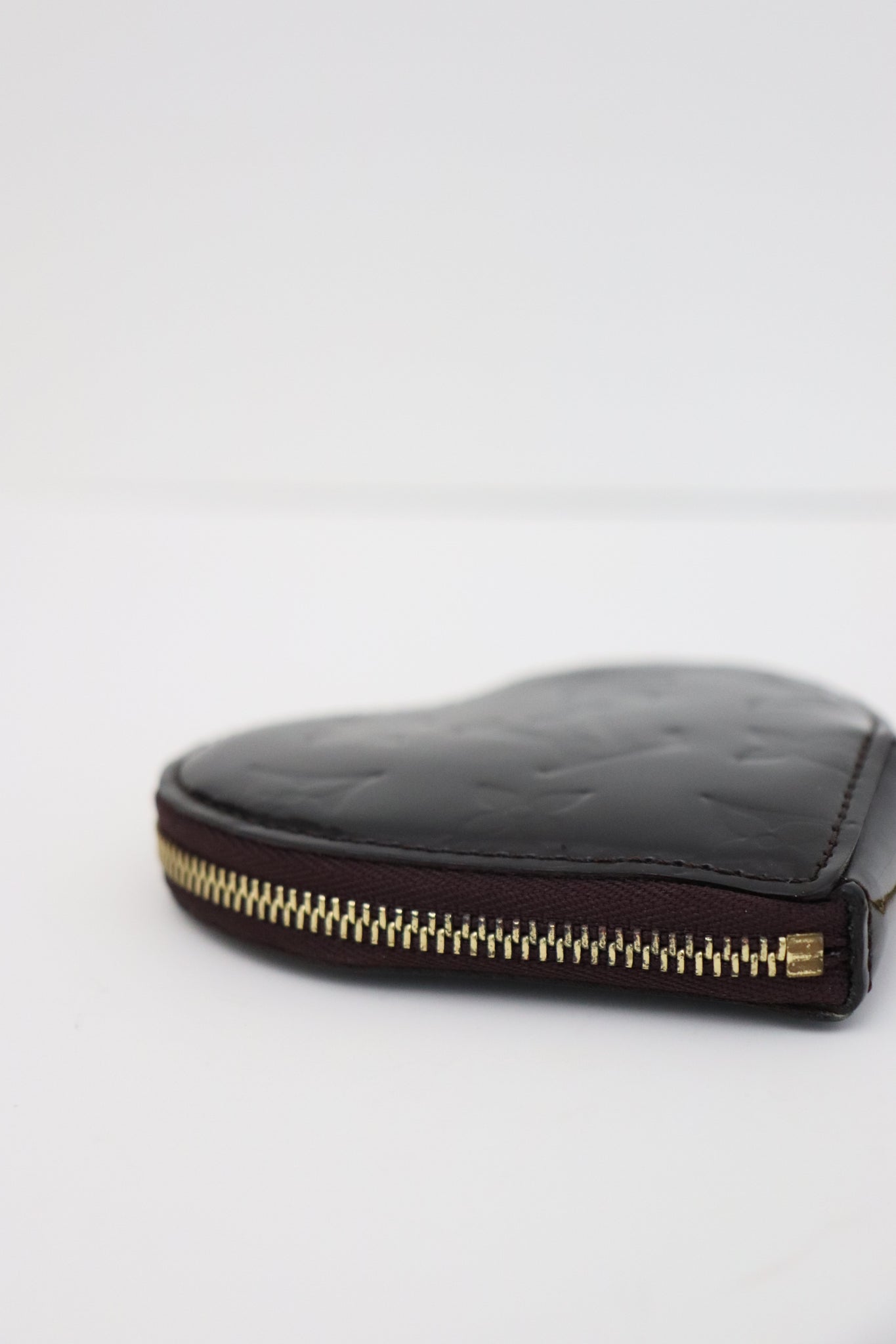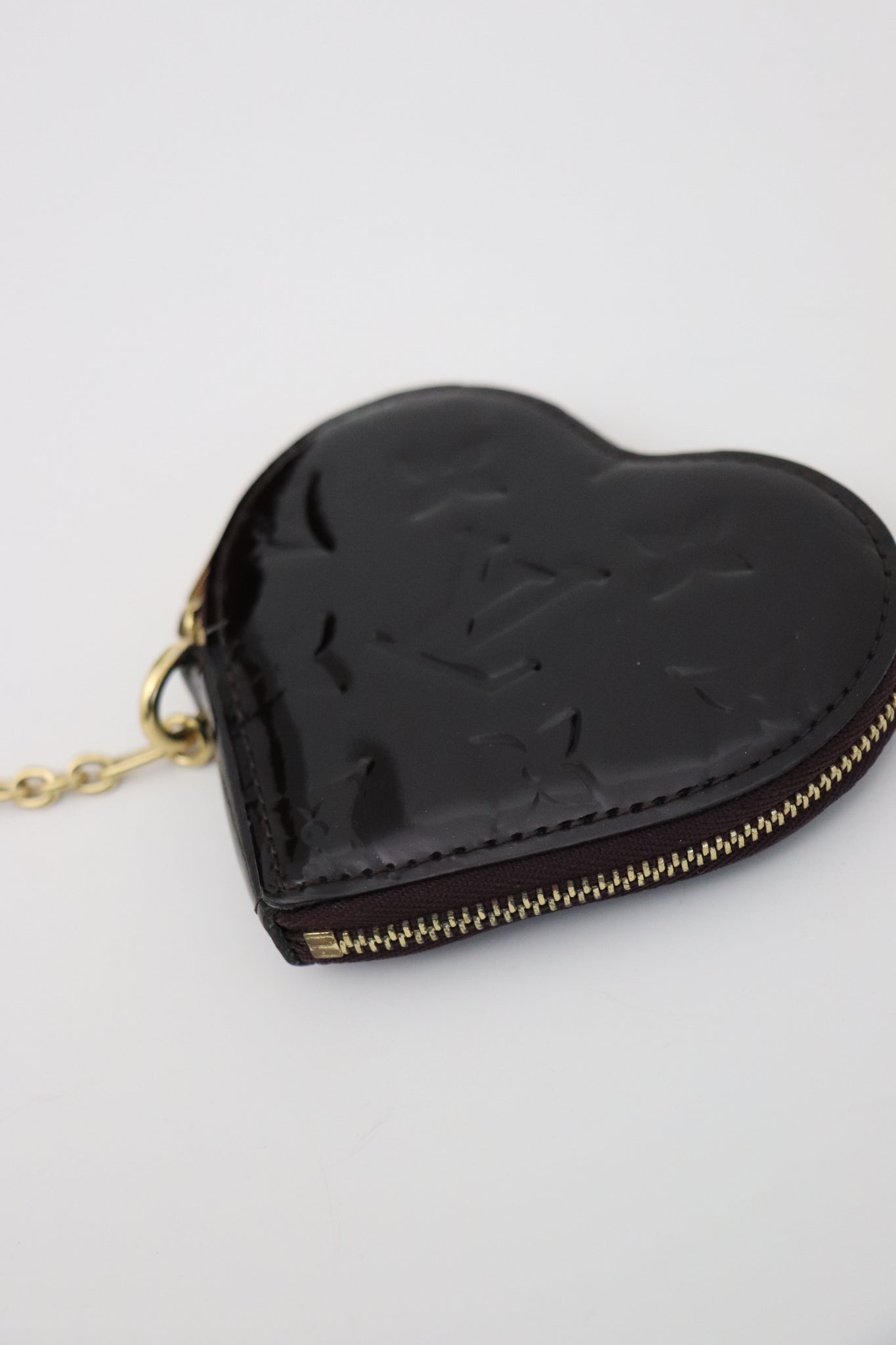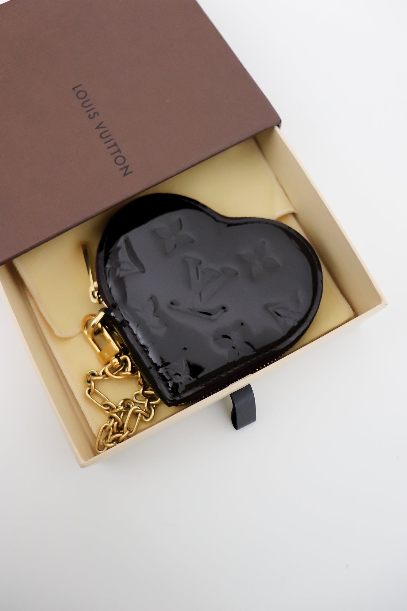This is an authentic LOUIS VUITTON Vernis Heart Coin Purse. This is a stylish coin purse that is crafted of Louis Vuitton monogram embossed Vernis patent leather. This heart-shaped pouch opens with a brass wrap-around zipper to an interior for coins and other valuables. The unique heart shape and the gorgeous pop of red and is the perfect way to add some fun and flair to any bag or outfit! You can fit your mini essentials such as a lipstick and cash.