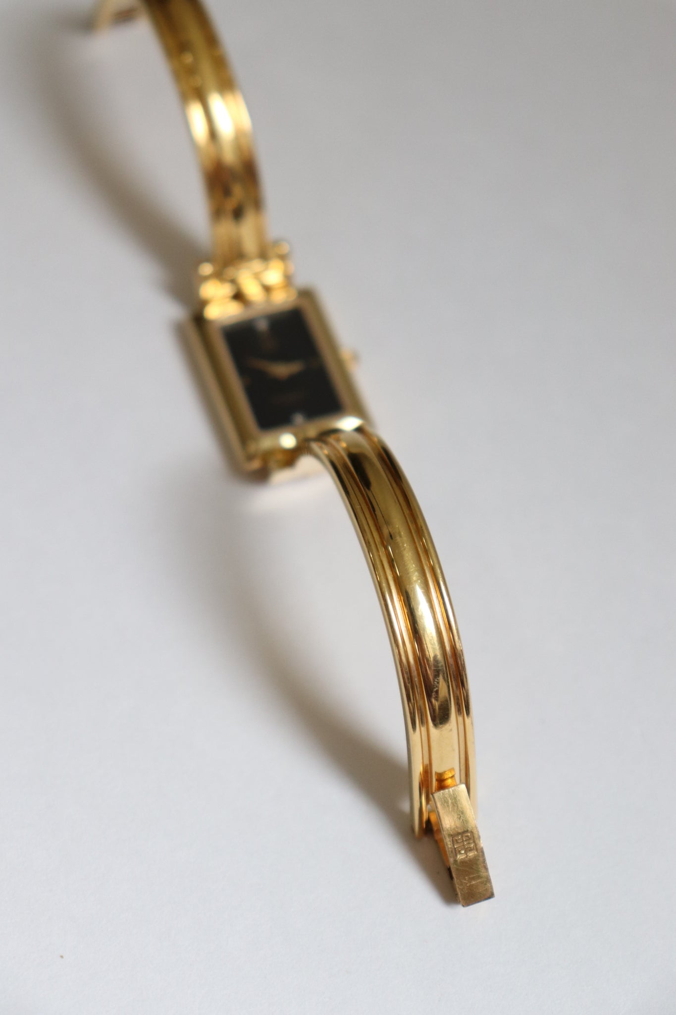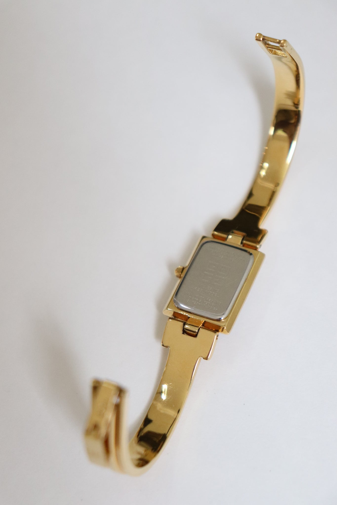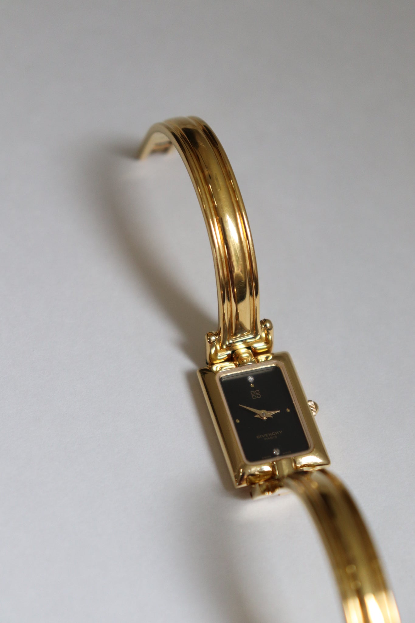 A true 90s statement piece. This vintage Givenchy bangle watch stuns with its sleek black dial, sparkling diamond accents, and bold gold-plated frame. Equal parts jewelry and timepiece — effortlessly chic, timeless, and unmistakably Givenchy.