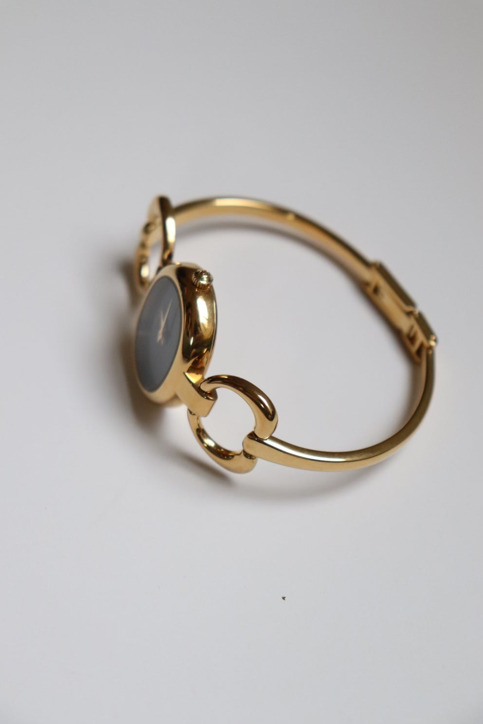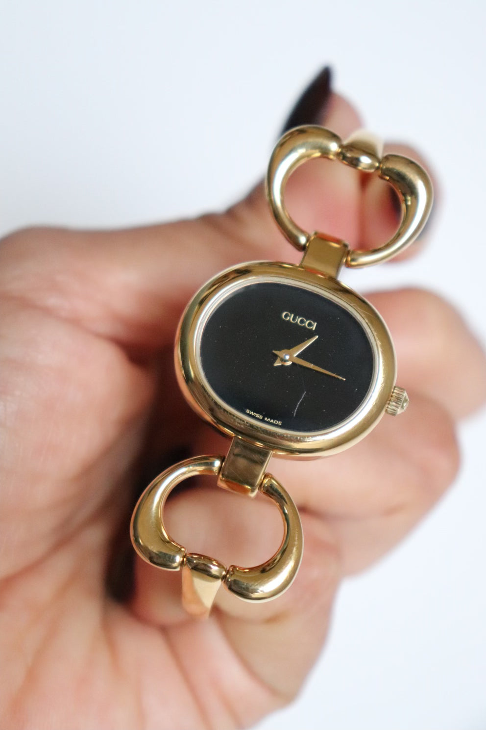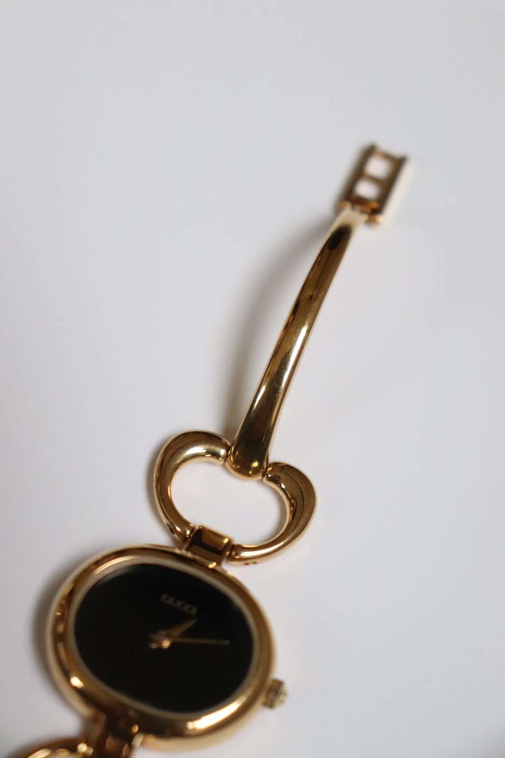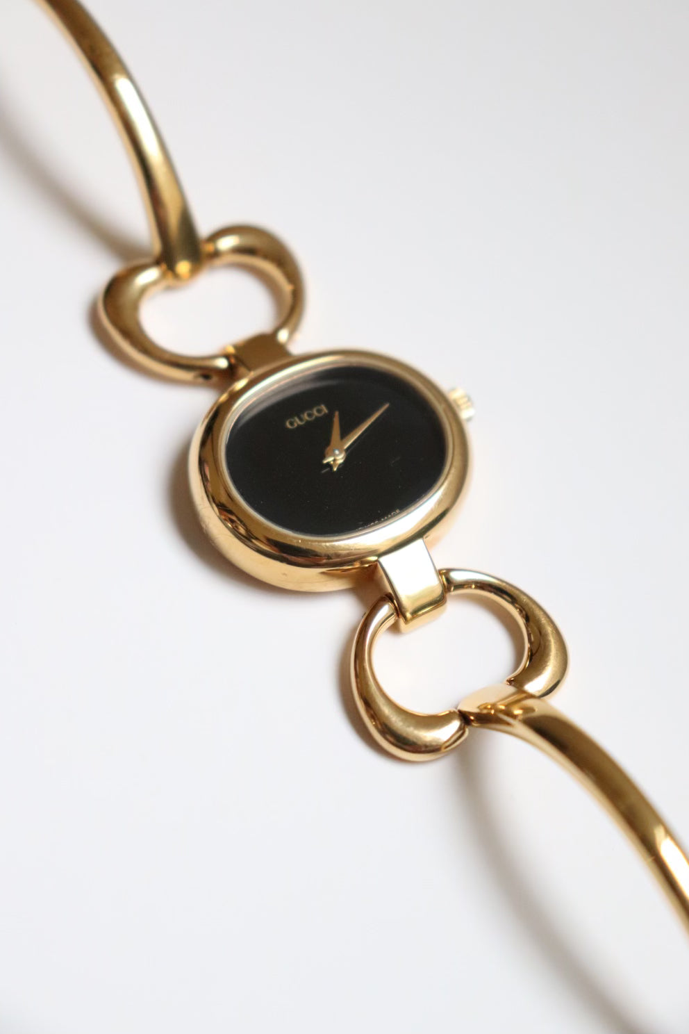 This authentic vintage Gucci gold bangle watch is a timeless statement piece. The polished gold-tone bracelet with iconic horsebit-style links gives it a jewelry-like feel, while the sleek black dial keeps the look elegant and minimal. Easy to dress up or wear every day, it adds effortless sophistication to any outfit.