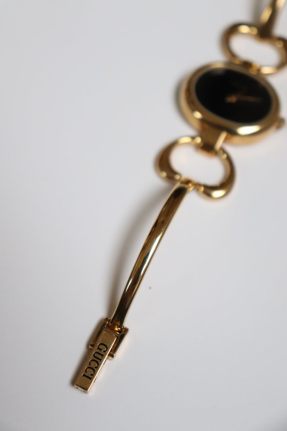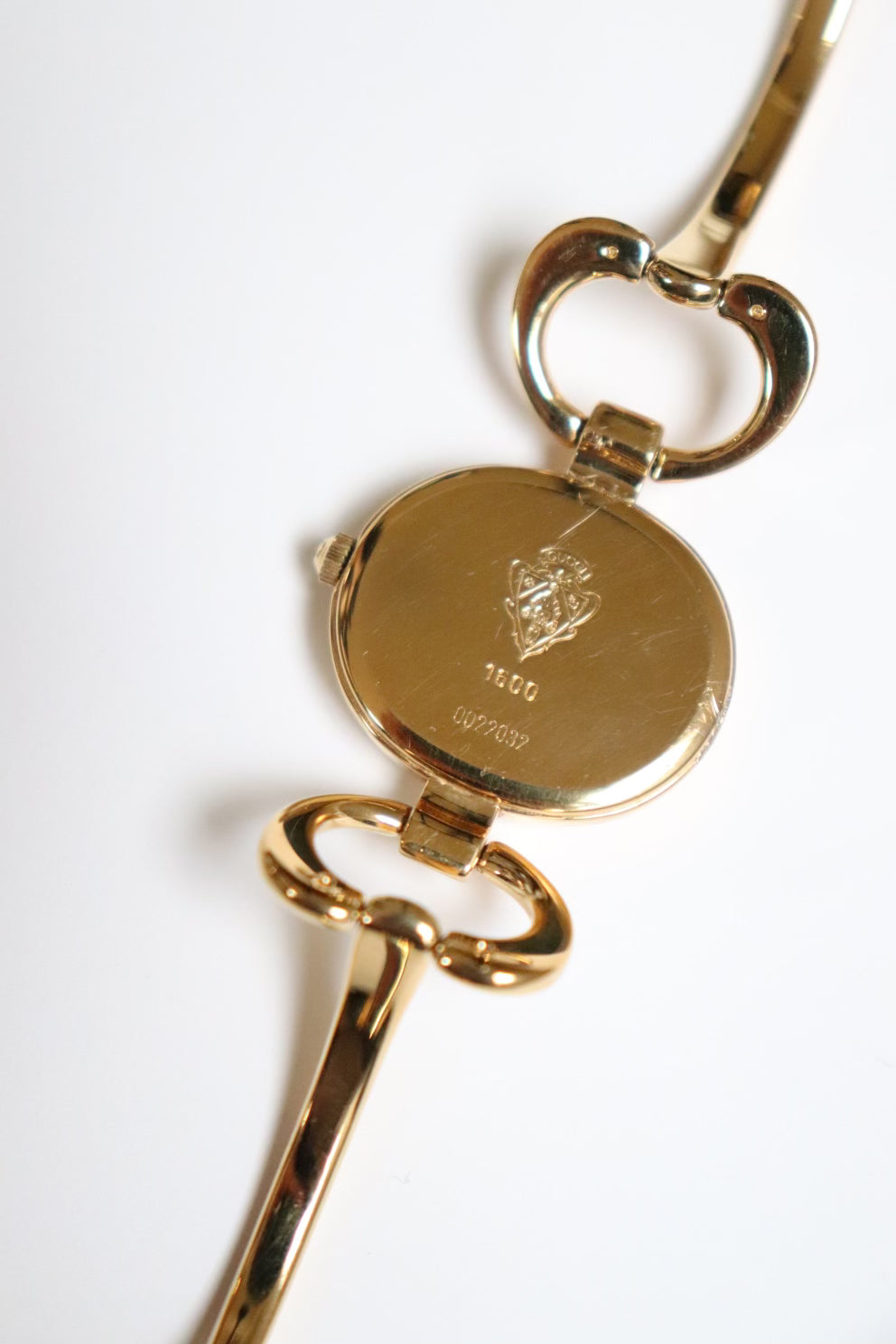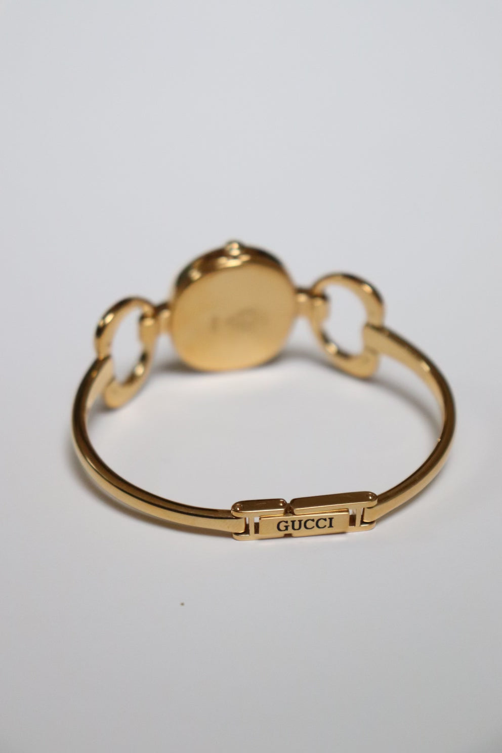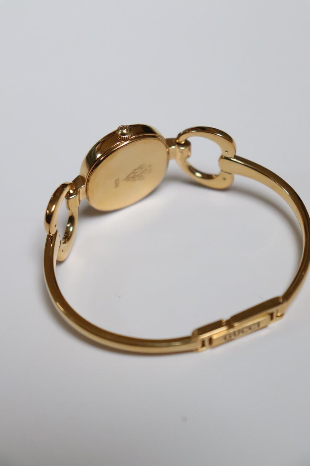 This authentic vintage Gucci gold bangle watch is a timeless statement piece. The polished gold-tone bracelet with iconic horsebit-style links gives it a jewelry-like feel, while the sleek black dial keeps the look elegant and minimal. Easy to dress up or wear every day, it adds effortless sophistication to any outfit.