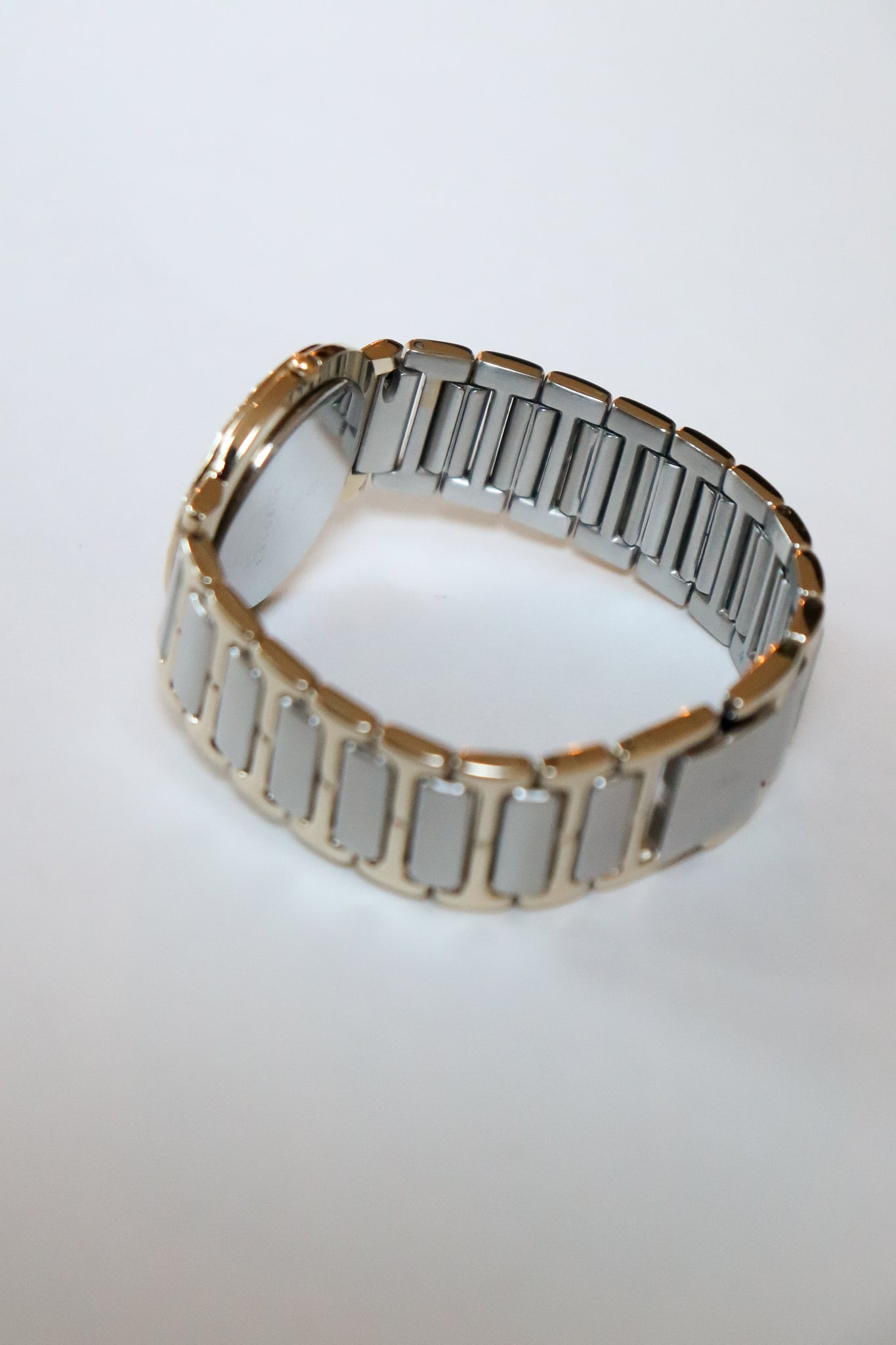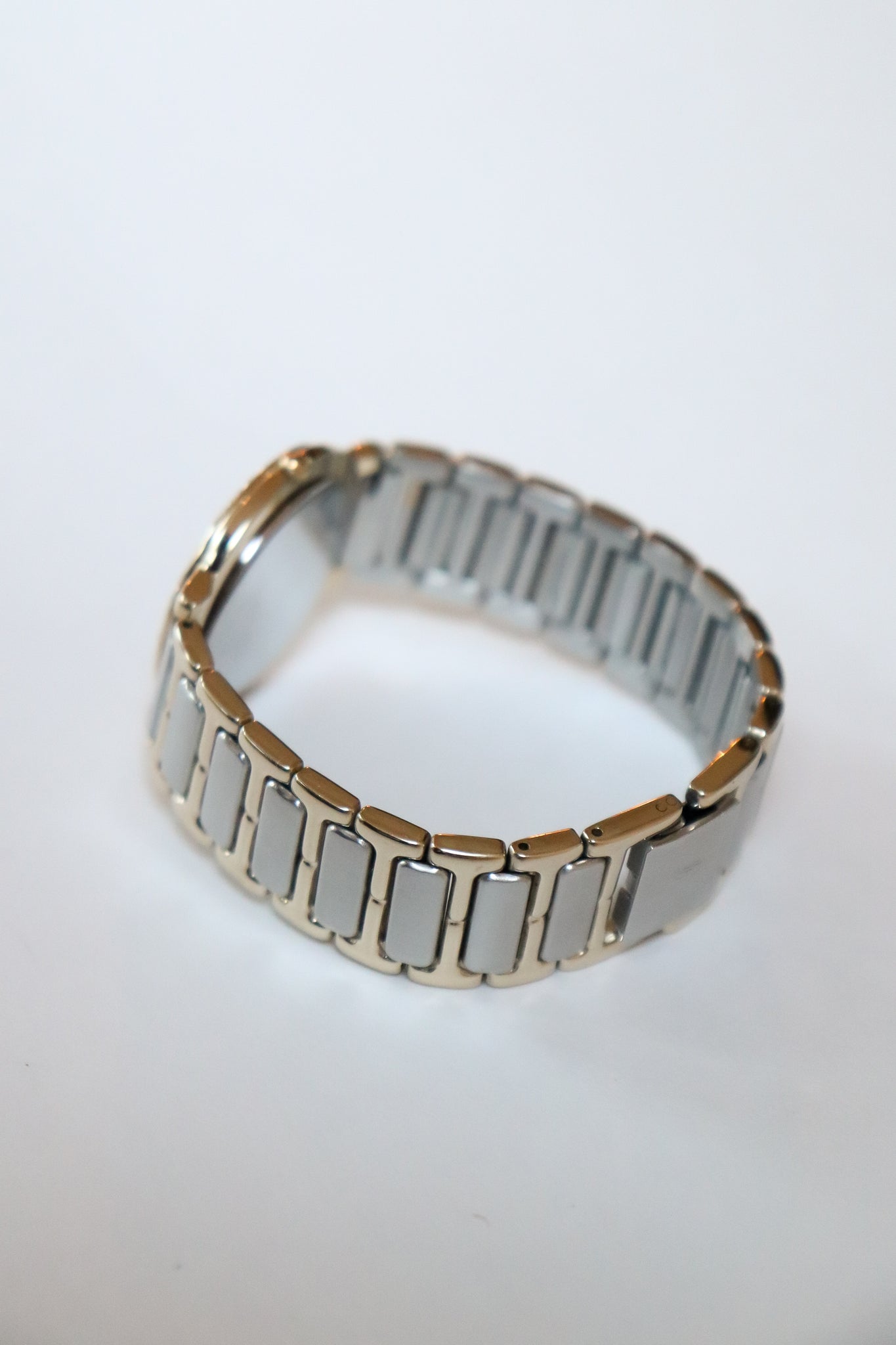 This vintage Yves Saint Laurent watch features a sleek black dial with minimalist gold-tone dot markers and matching hands. The polished gold bezel and two-tone bracelet blend refinement and versatility, while its Swiss quartz movement ensures timeless precision—a statement of quiet elegance for any occasion.