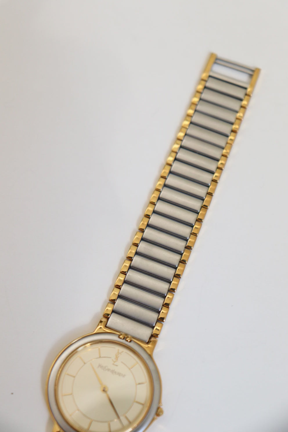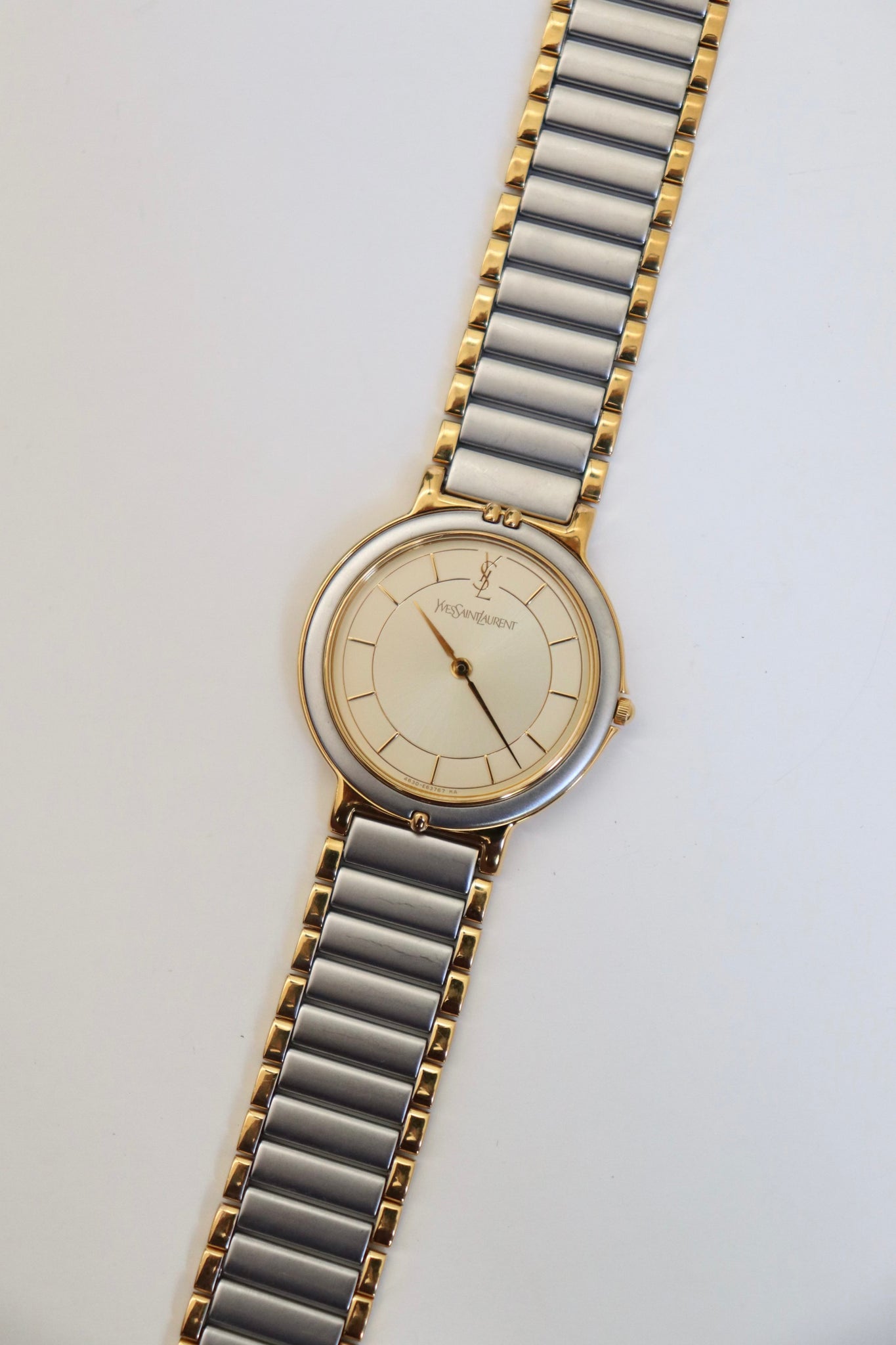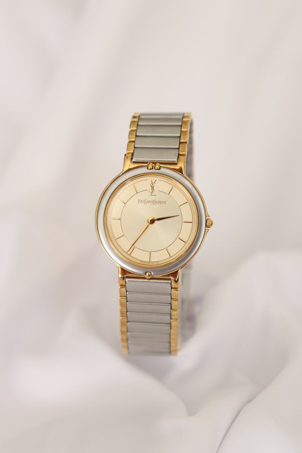 A refined classic, this vintage Yves Saint Laurent wristwatch showcases timeless French elegance with a sleek two-tone bracelet and a clean ivory dial. The round case is finished in a soft gold-tone, with a minimalist face adorned only by slim hour markers and the iconic YSL logo at 12 o’clock.