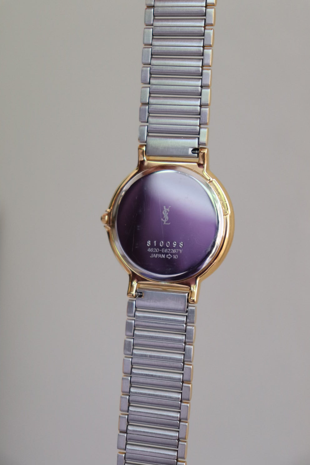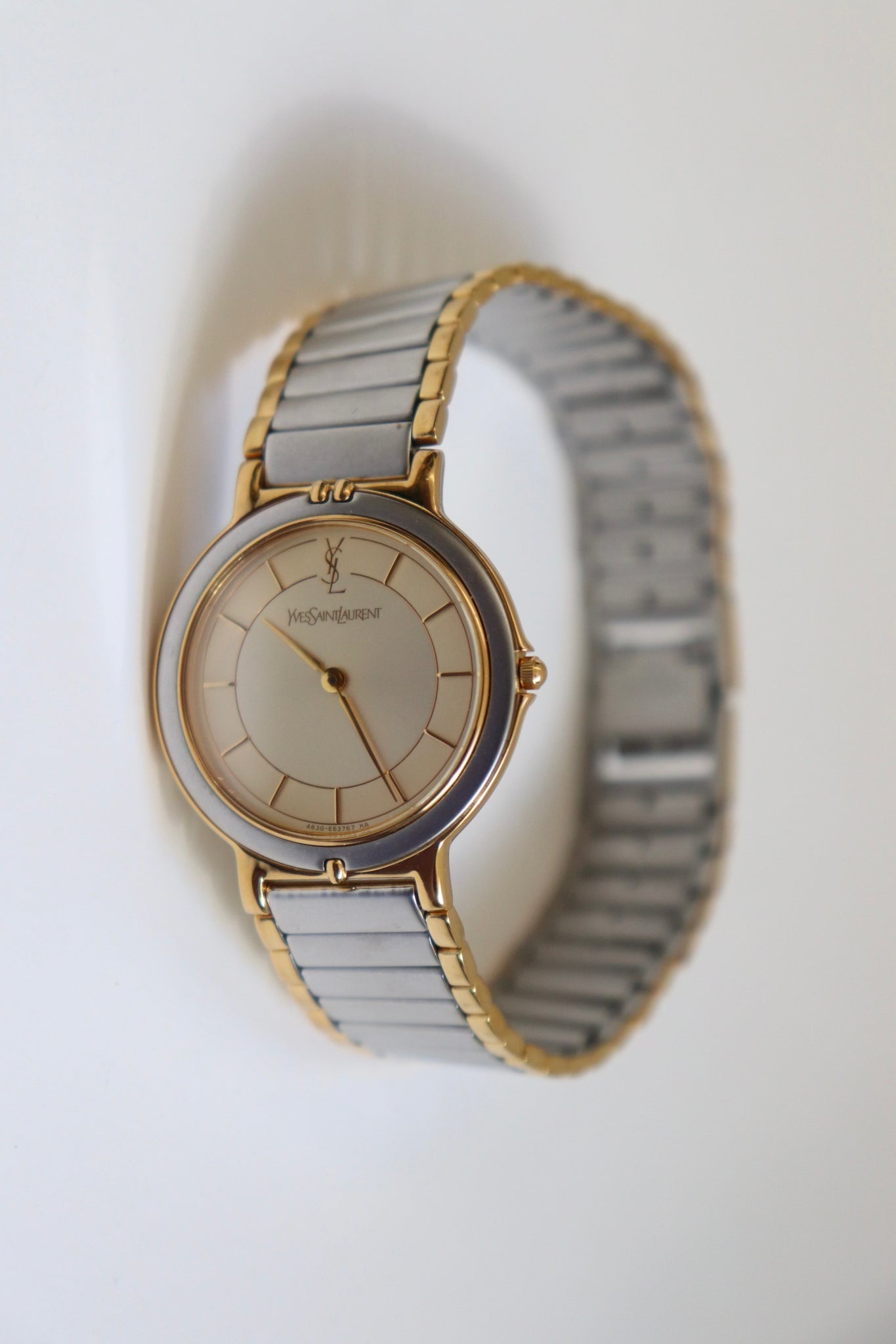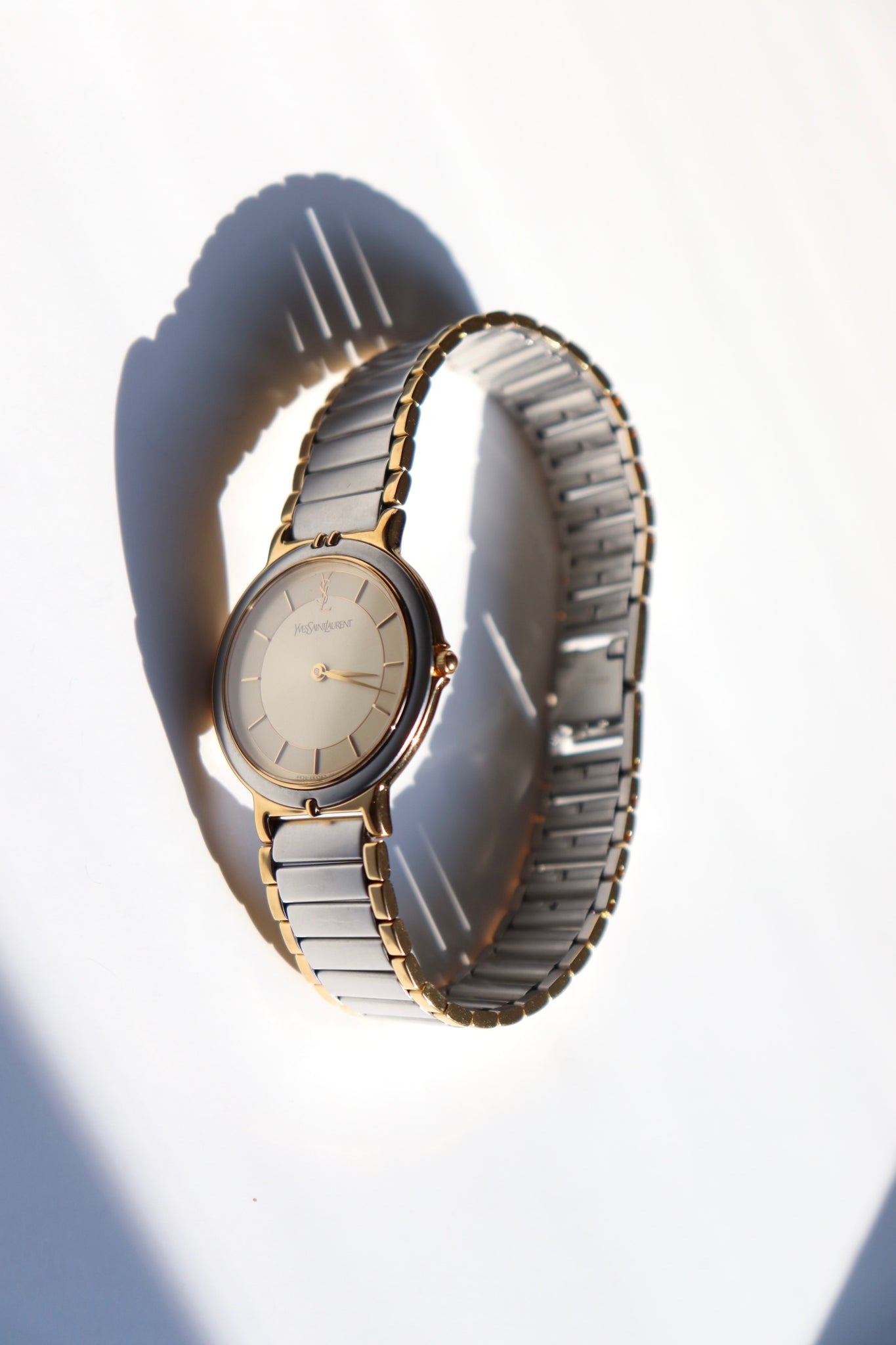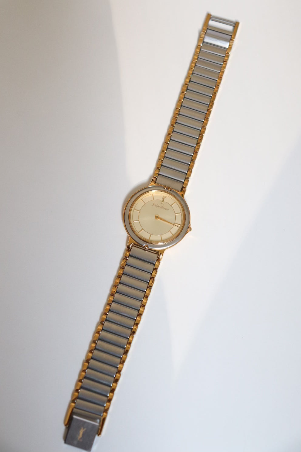 A refined classic, this vintage Yves Saint Laurent wristwatch showcases timeless French elegance with a sleek two-tone bracelet and a clean ivory dial. The round case is finished in a soft gold-tone, with a minimalist face adorned only by slim hour markers and the iconic YSL logo at 12 o’clock.