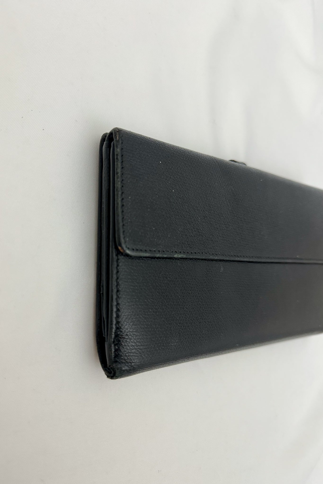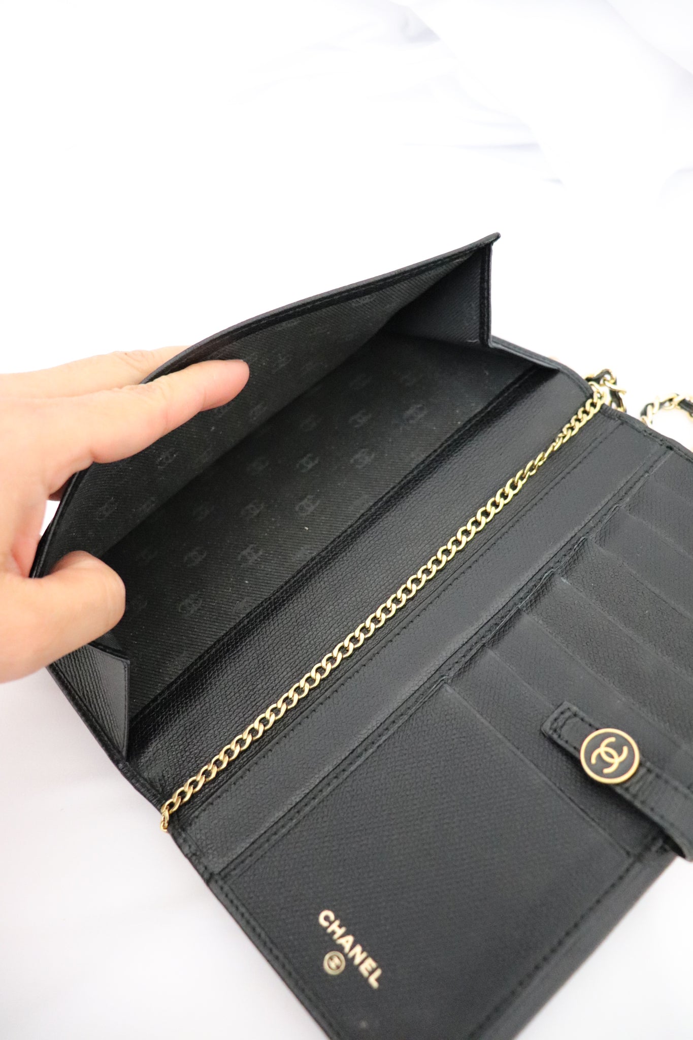 Chanel black grained calfskin long wallet has a golden/black snap button. The back has a snap close expandable pocket with CC logos inside. On the front of the wallet you can open it to a compartment of credit cards, large and small pockets for bills and credit cards. Fits iphone 15 Pro in the pocket (last pic)