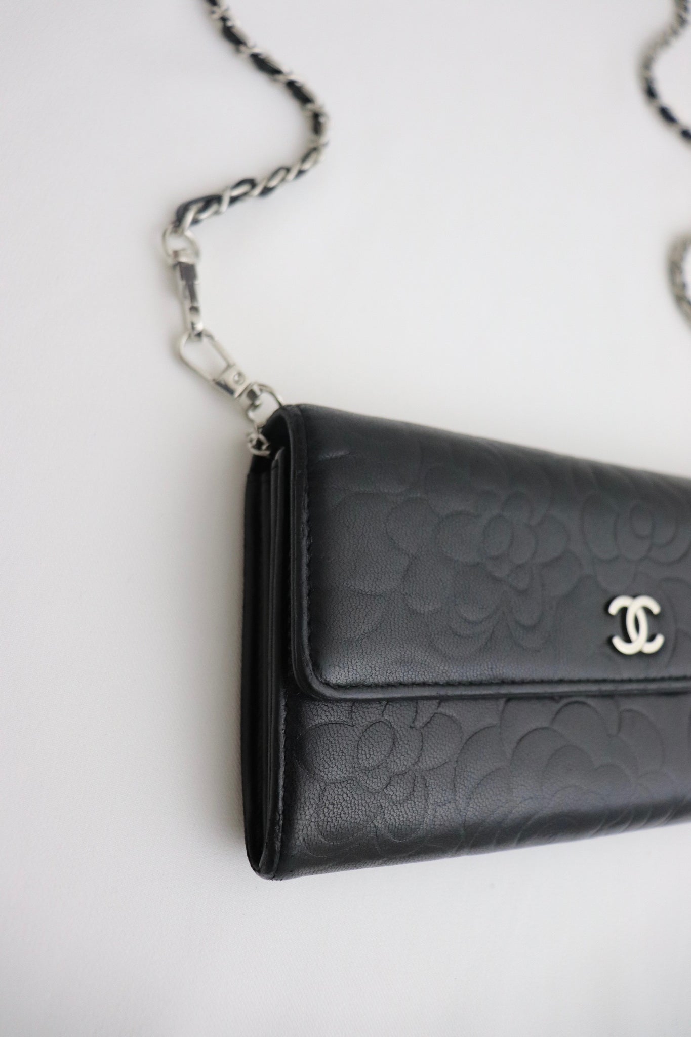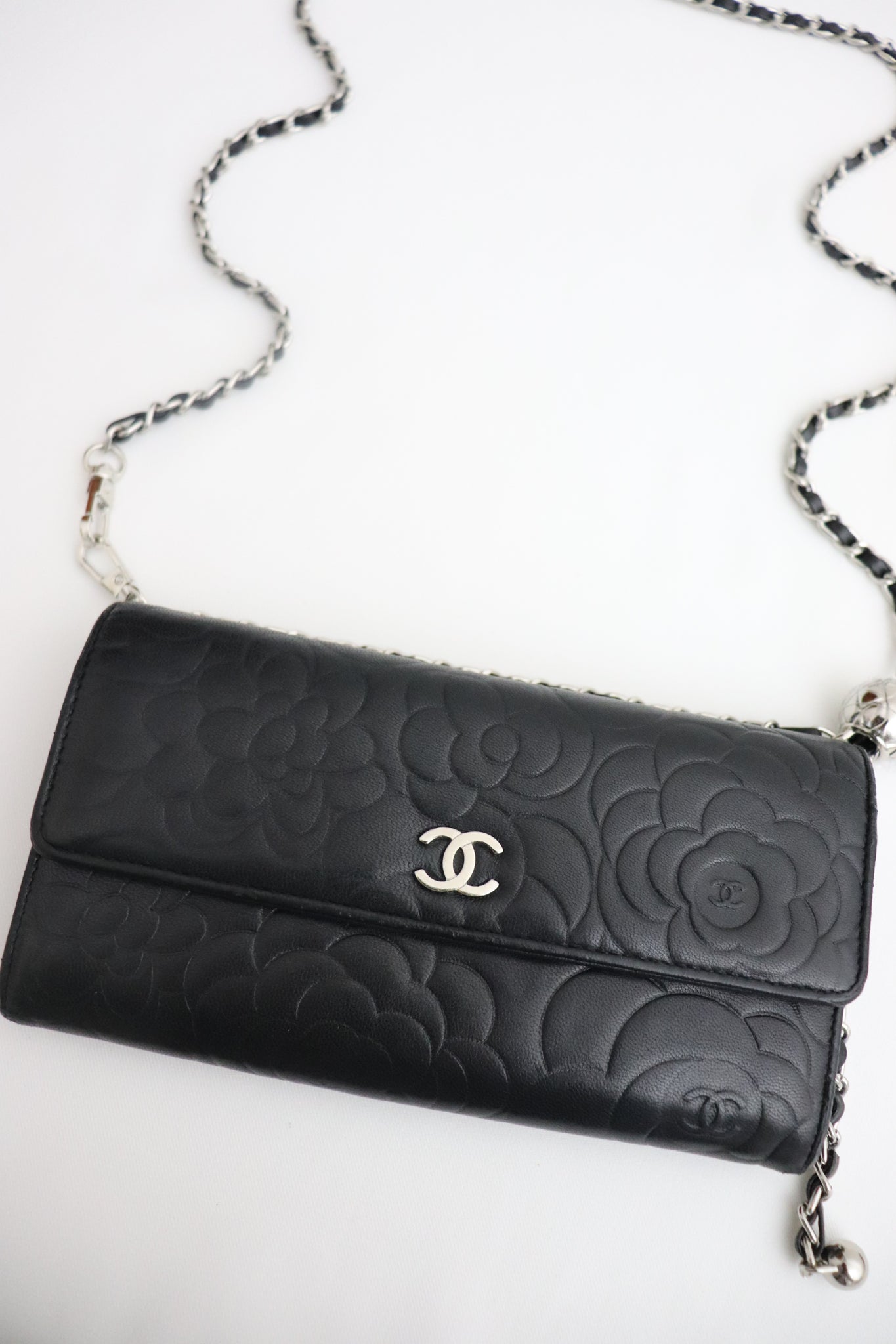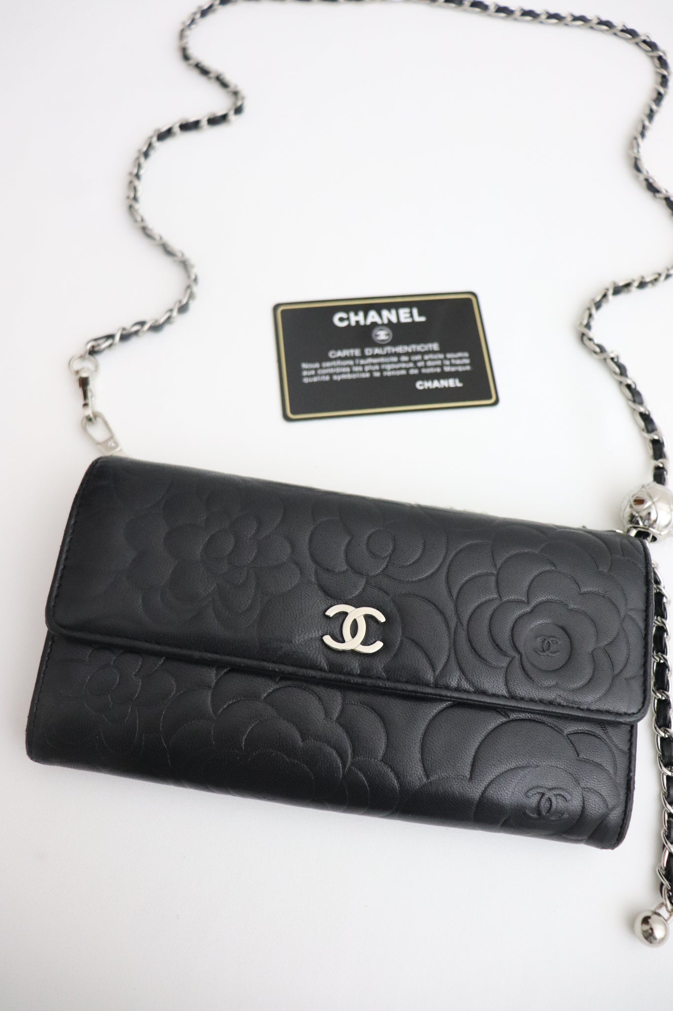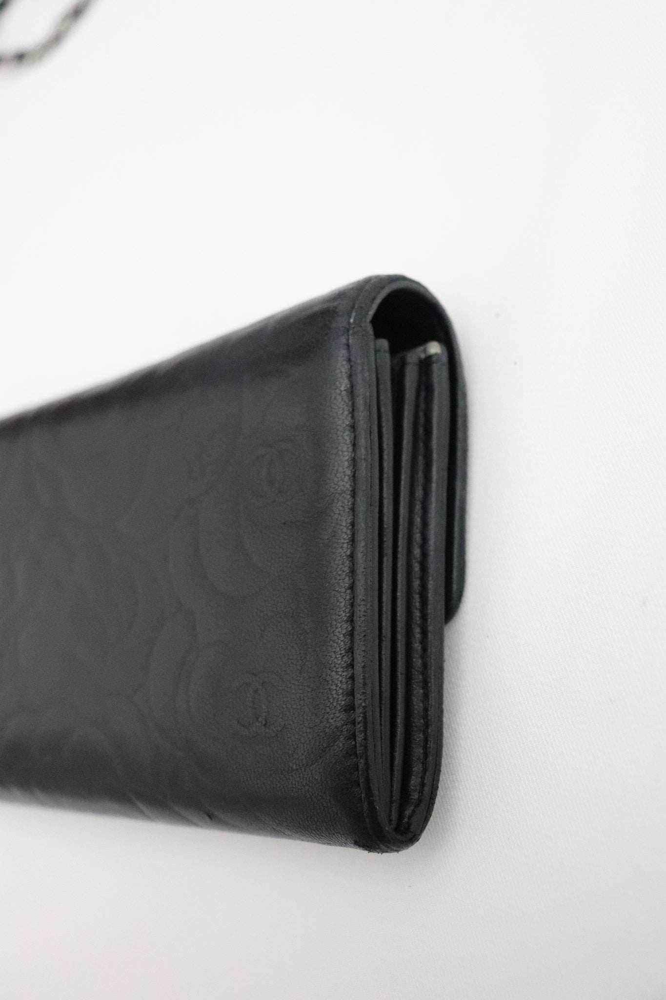 Classic Chanel wallet rendered in black lambskin leather, featuring embossed Camellia flower stamp throughout the exterior of the wallet and silver-tone hardware. Flip the wallet open to reveal a contrasting metallic silver leather lining. Crafted in 2014.