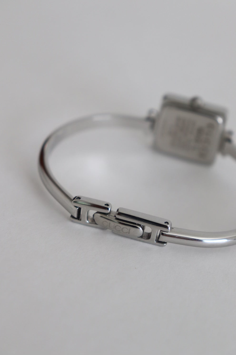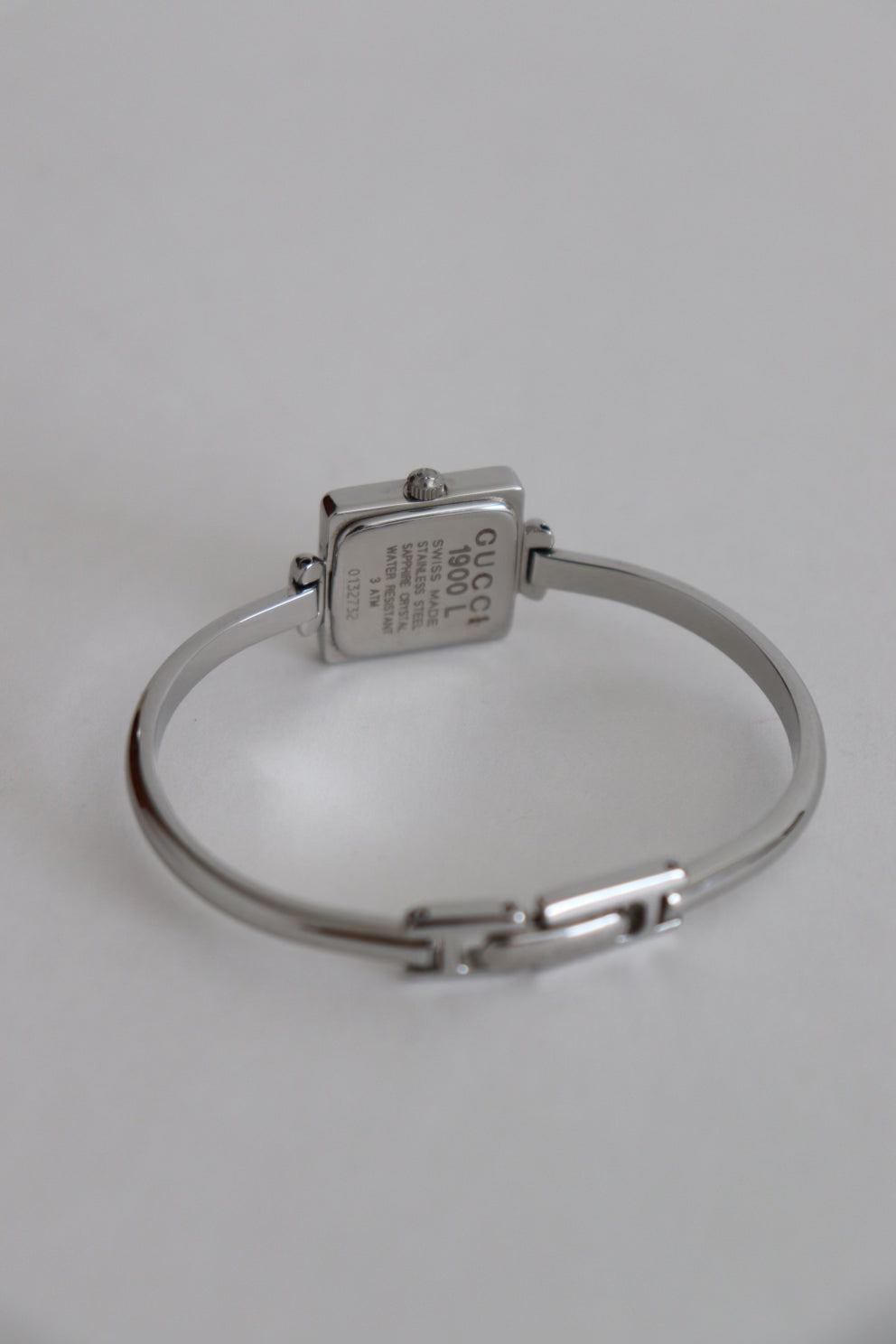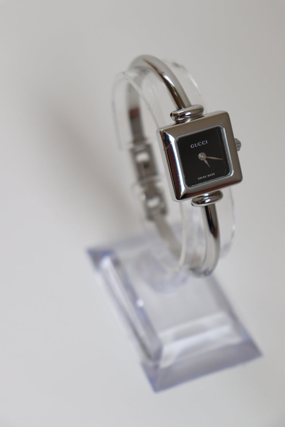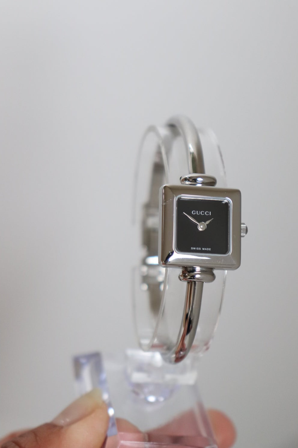 Timeless and sleek, this Gucci 1990L women’s wristwatch features a striking square stainless steel case, paired with a deep black dial and minimalist silver-tone hands and hour markers. The understated design and monochromatic palette reflect Gucci’s signature blend of elegance and modernity.