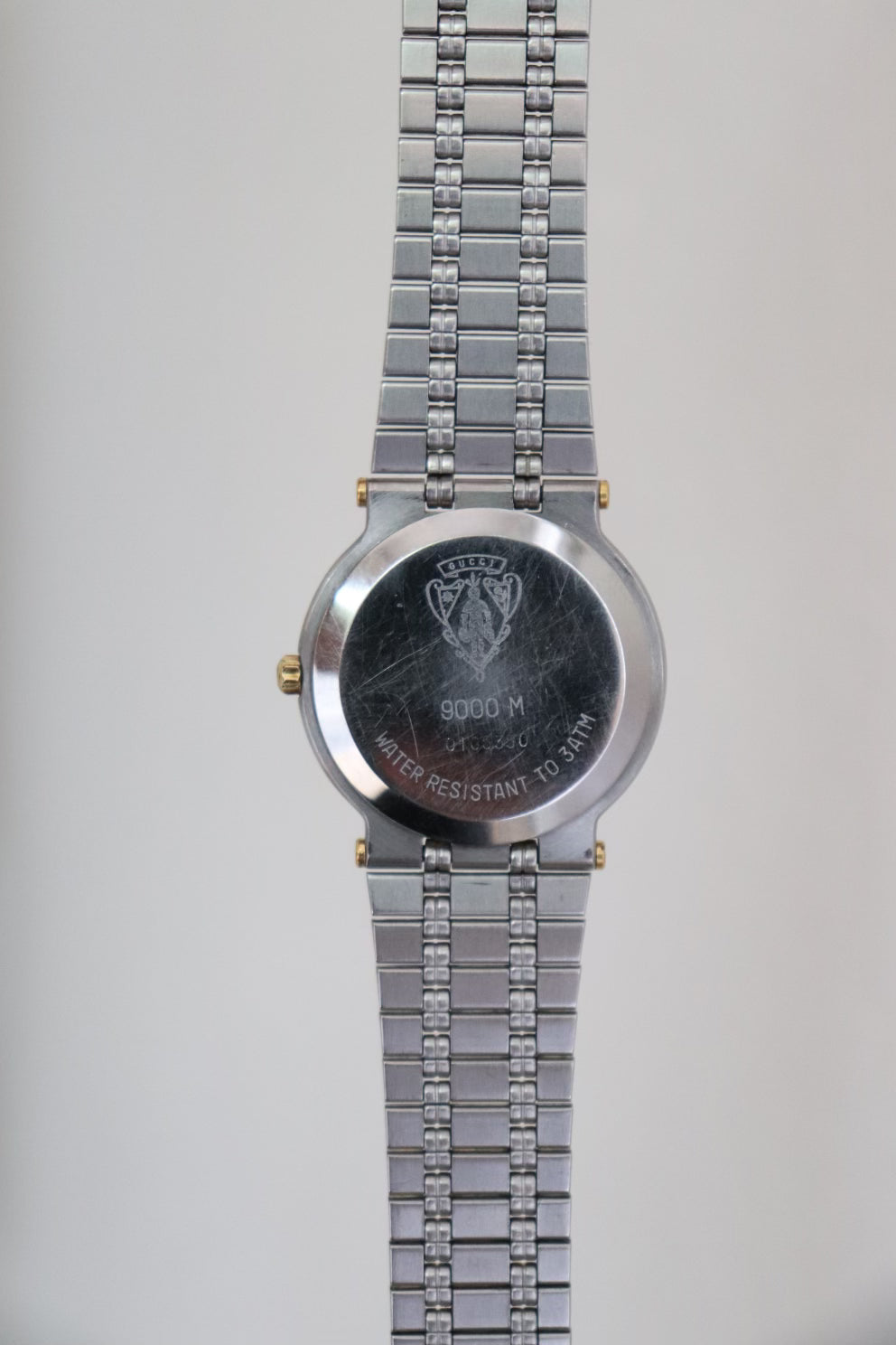 Gucci 9000M Two-Tone Vintage Watch. Timeless, classy, and oh-so-Gucci. This vintage gem mixes stainless steel with gold-tone details for that effortlessly chic two-tone look. The gold dial? Sleek and simple. The signature Gucci “G” screws? A total flex. Powered by Swiss quartz, it keeps you stylish and on time.