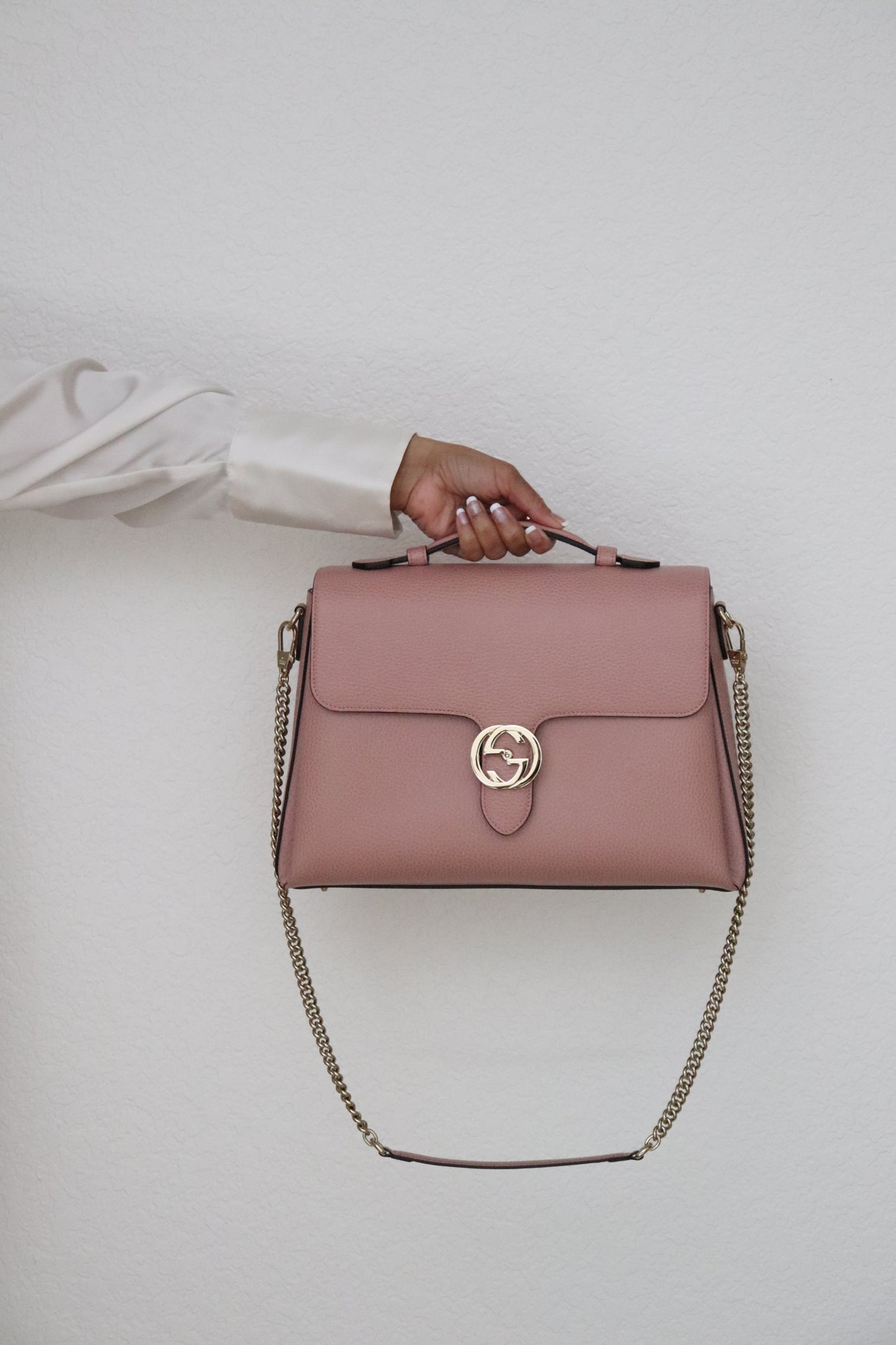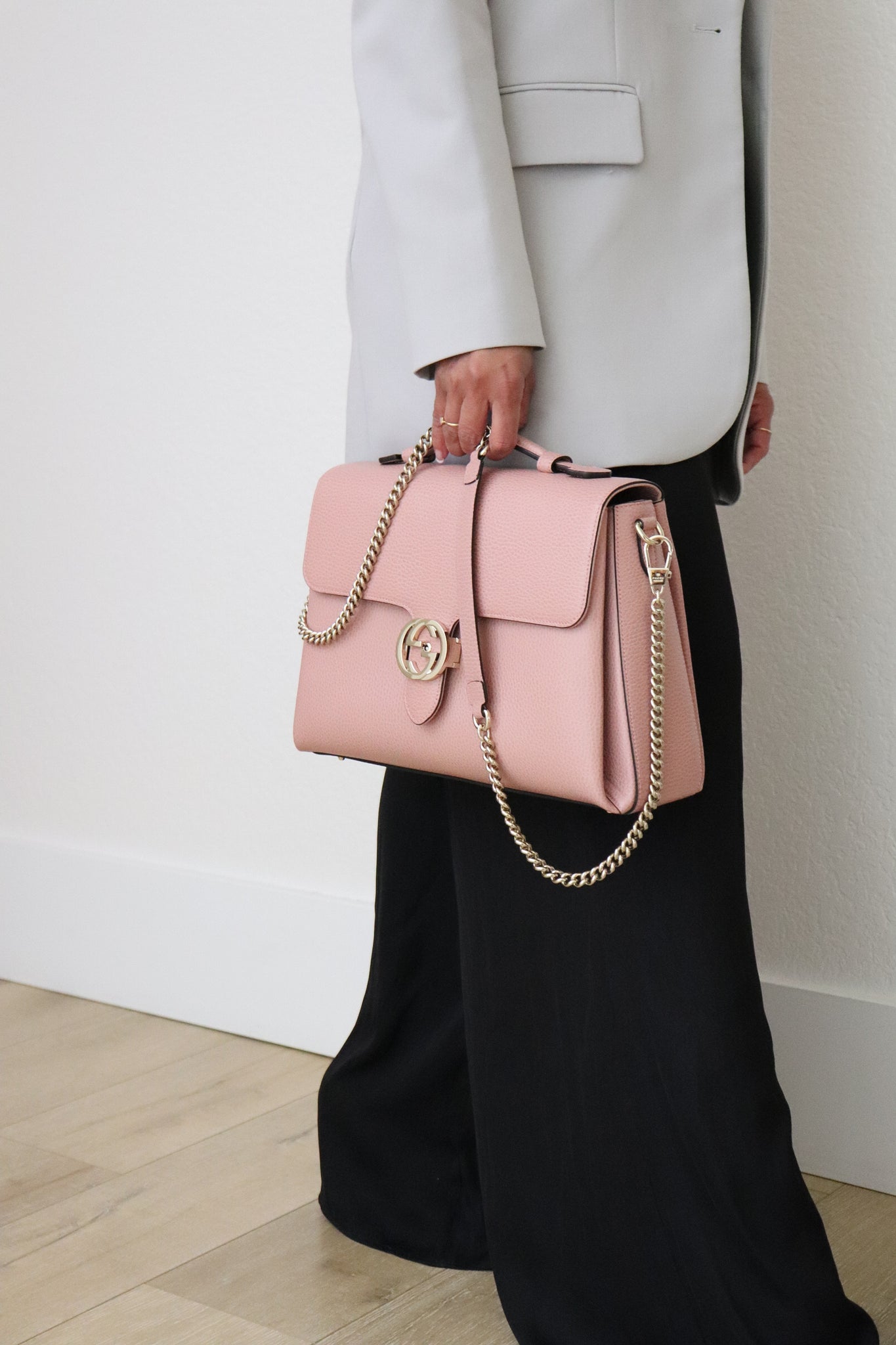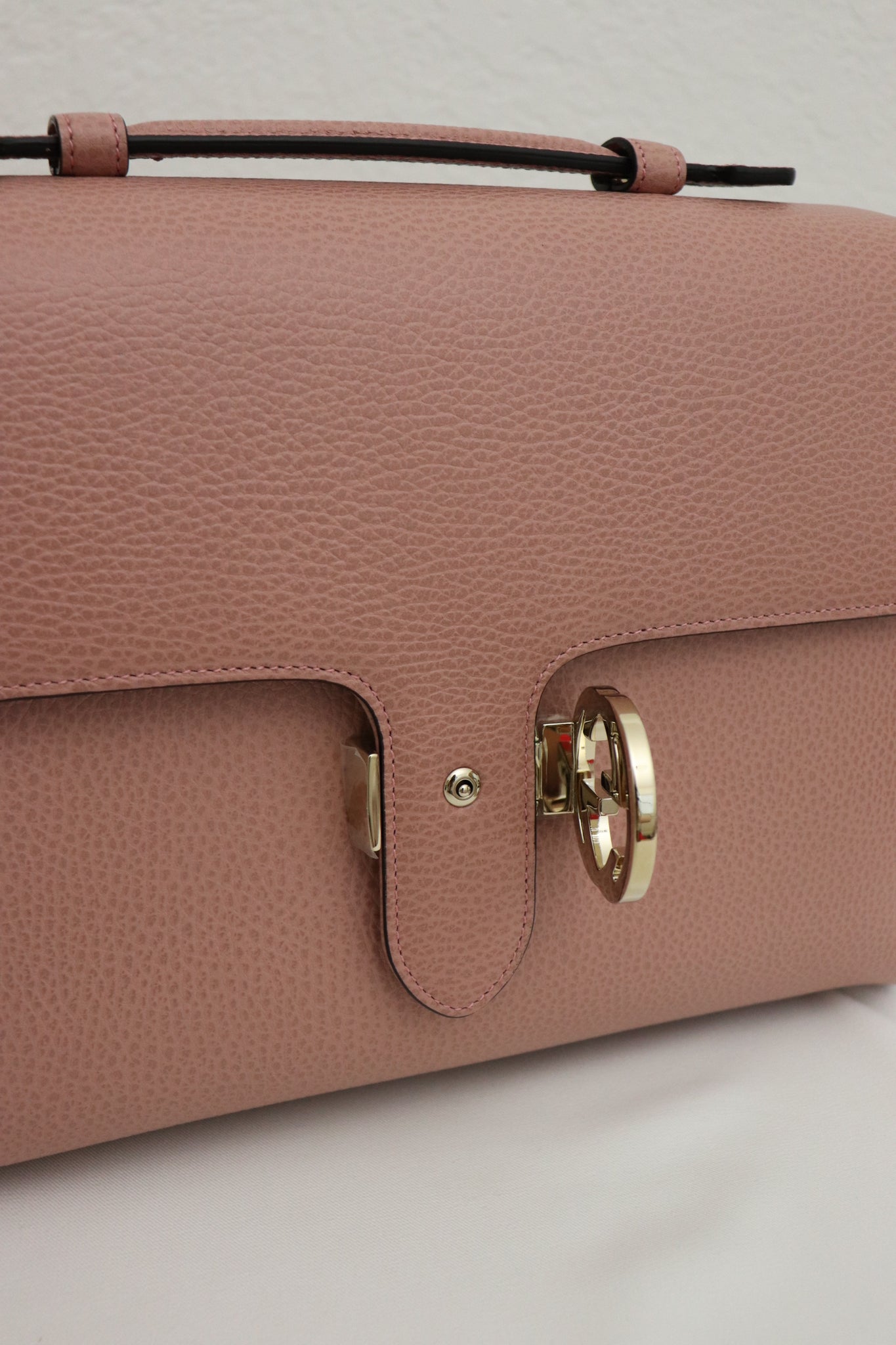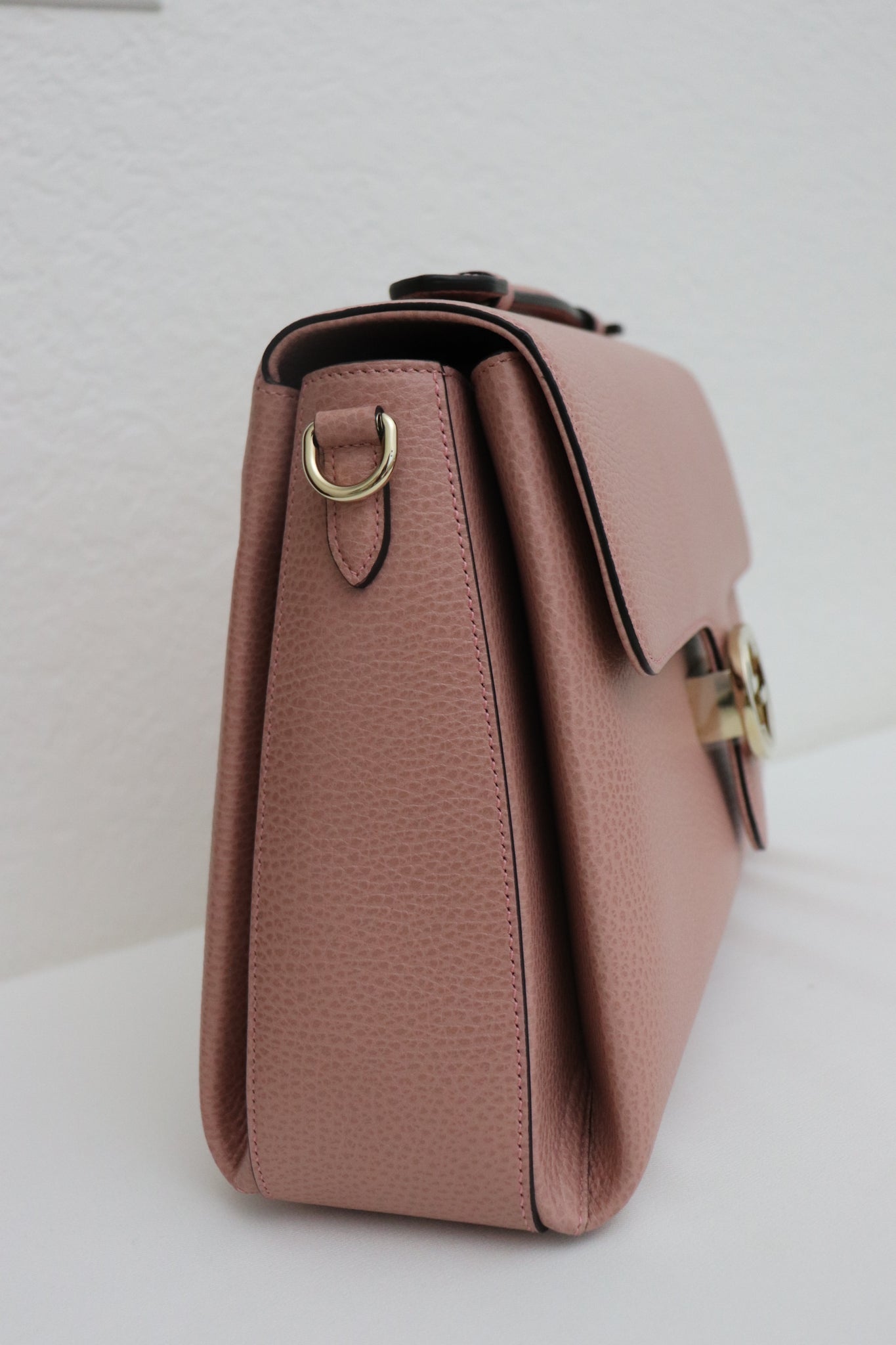 GUCCI Dollar Calfskin Interlocking G Top Handle Shoulder Bag in Soft Pink. This chic shoulder bag is crafted of grained calfskin leather in light pink. The bag has a waist-length shoulder strap and a facing flap with a polished silver interlocking G emblem. The flap opens to a partitioned natural fabric interior with zipper and patch pockets. Retails for $1699