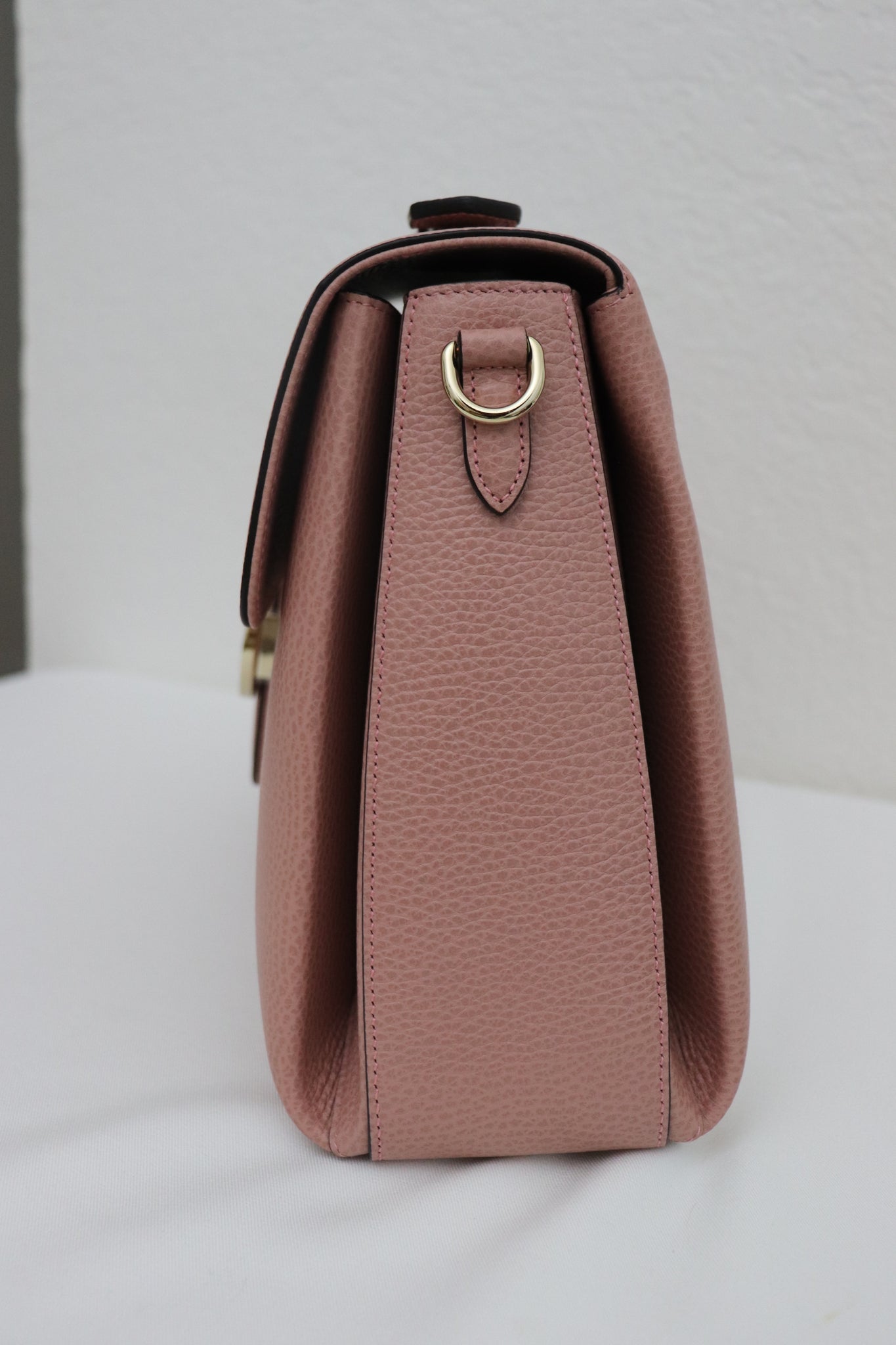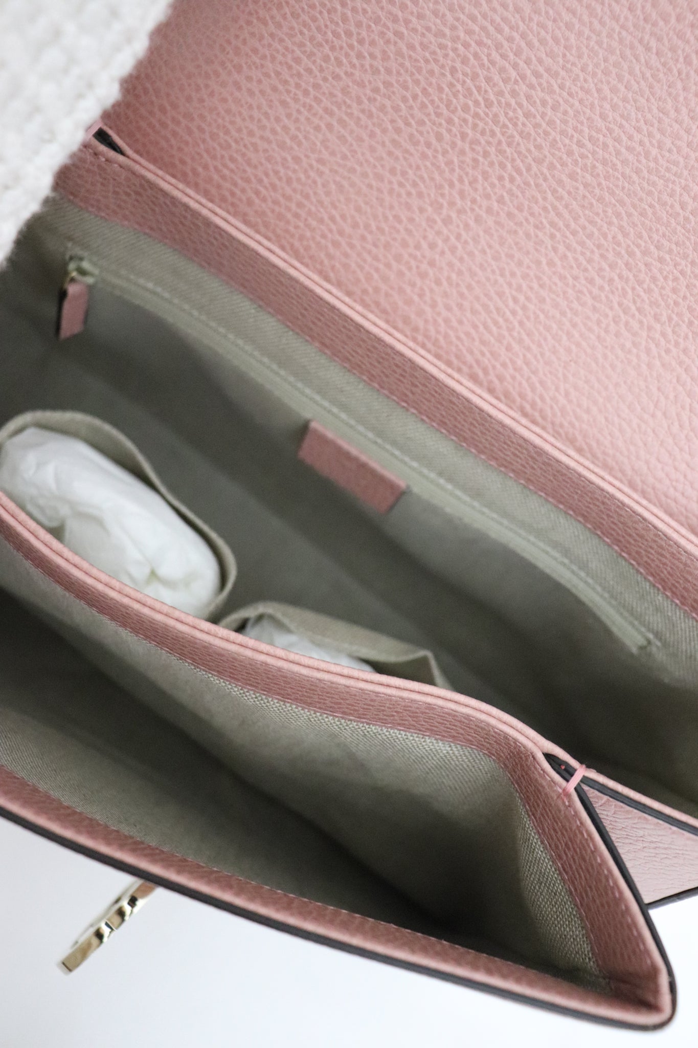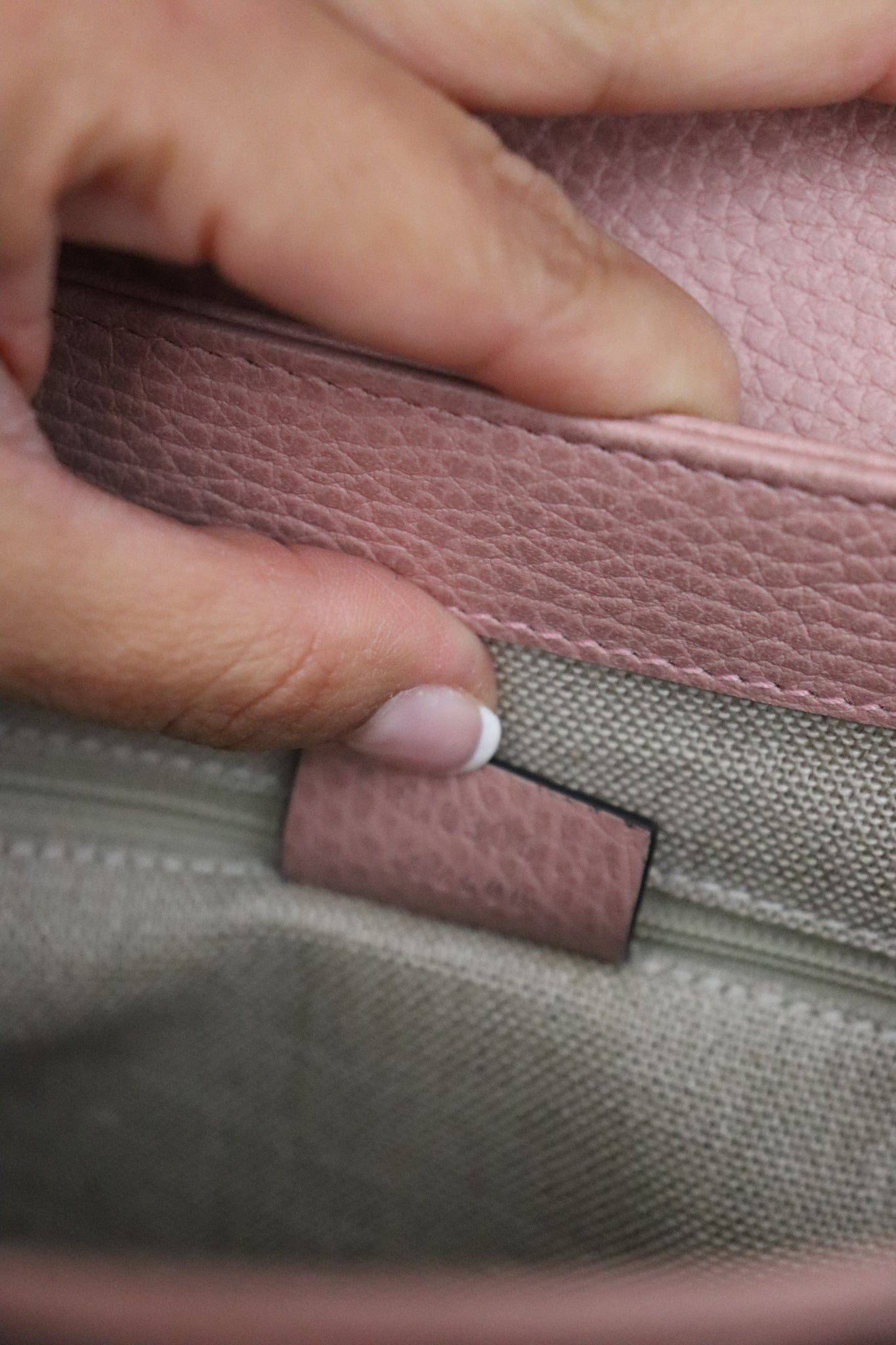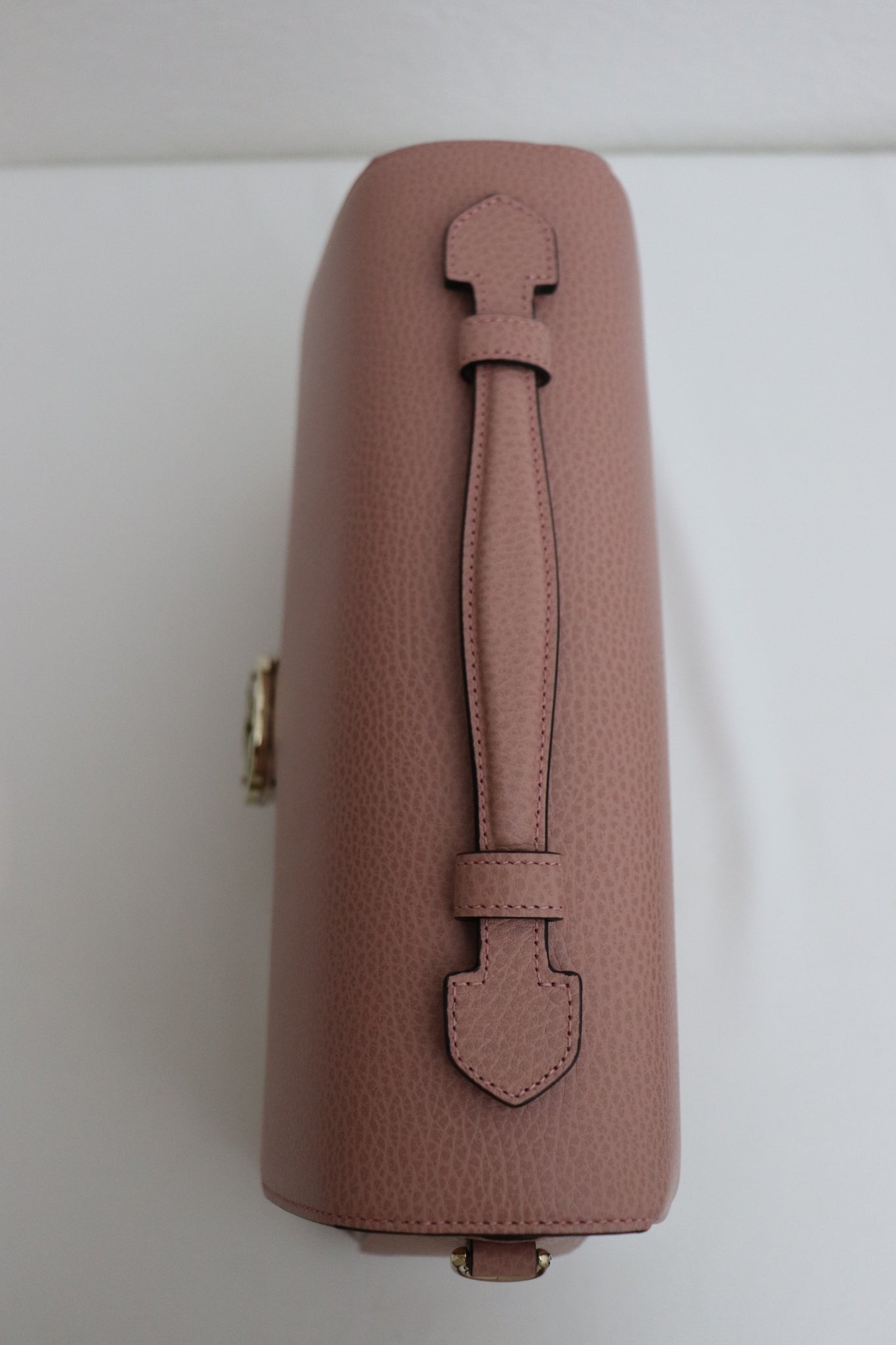 GUCCI Dollar Calfskin Interlocking G Top Handle Shoulder Bag in Soft Pink. This chic shoulder bag is crafted of grained calfskin leather in light pink. The bag has a waist-length shoulder strap and a facing flap with a polished silver interlocking G emblem. The flap opens to a partitioned natural fabric interior with zipper and patch pockets. Retails for $1699