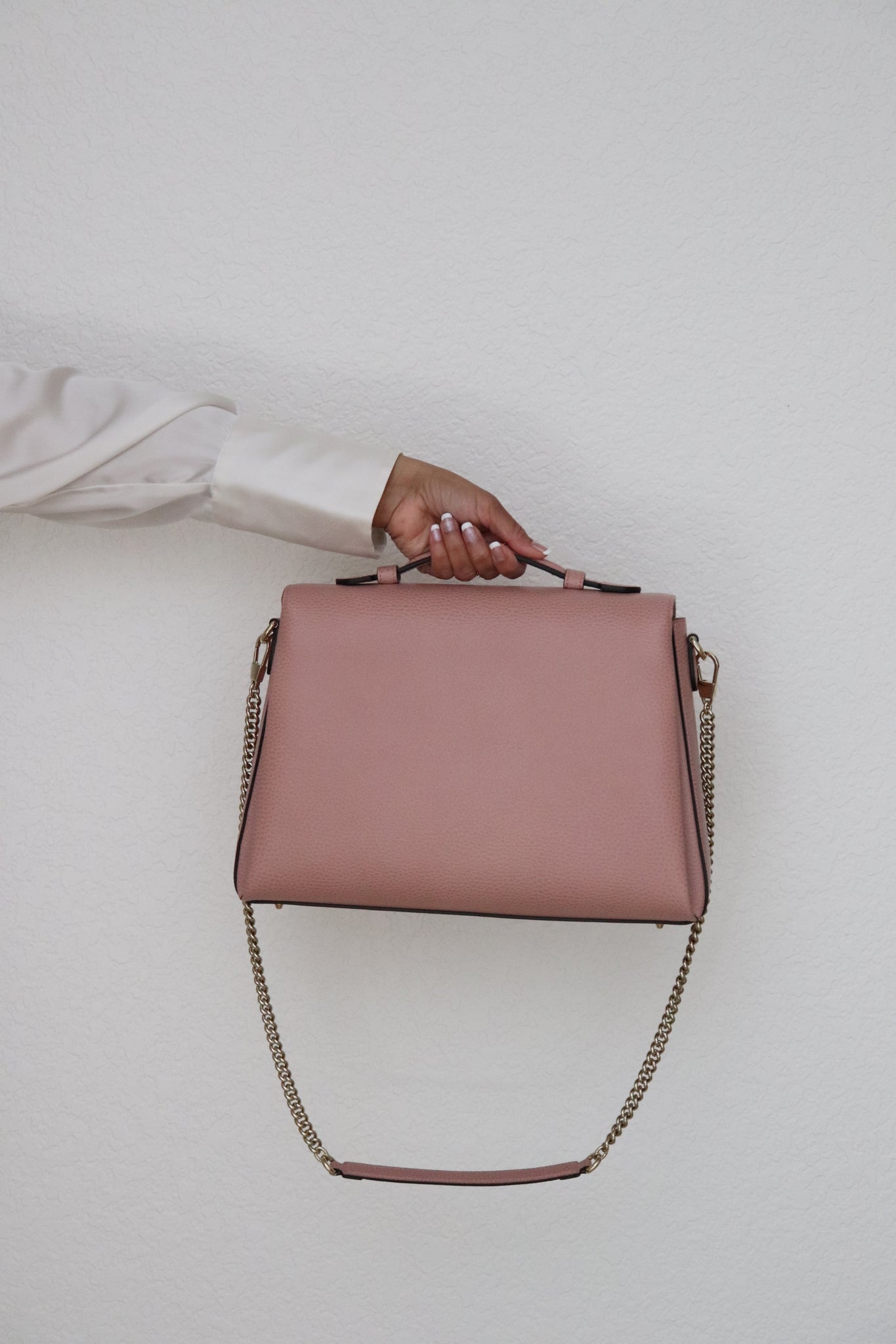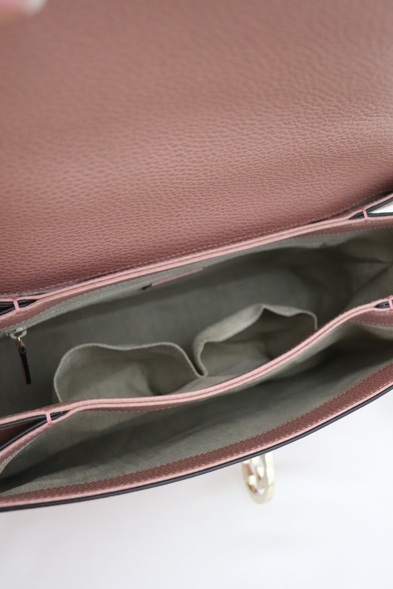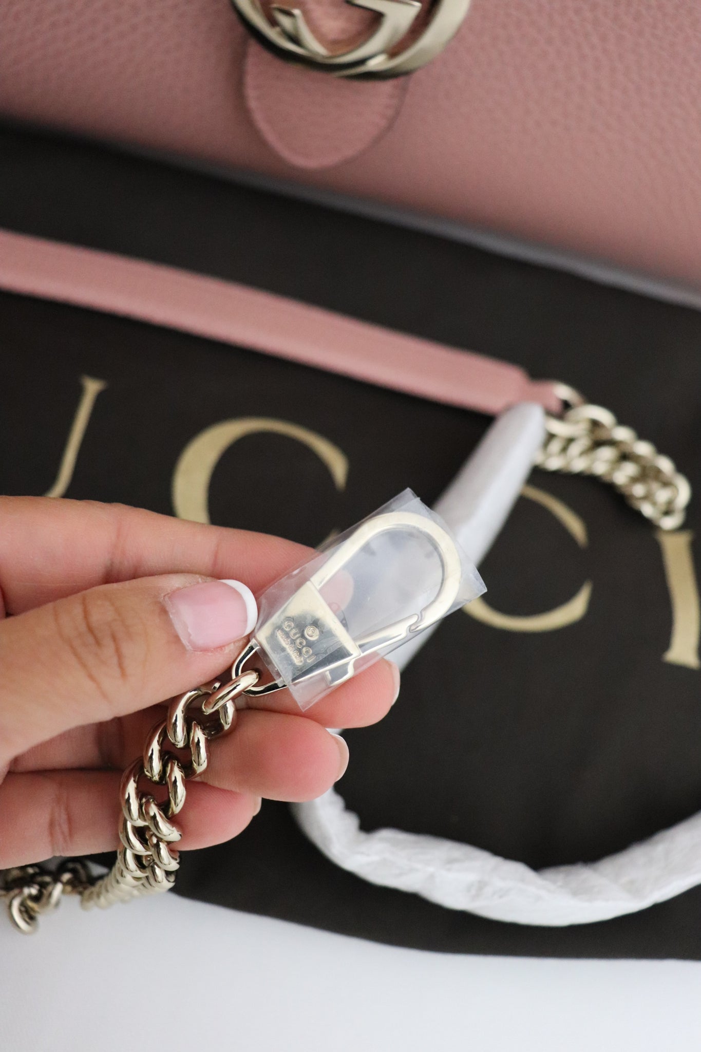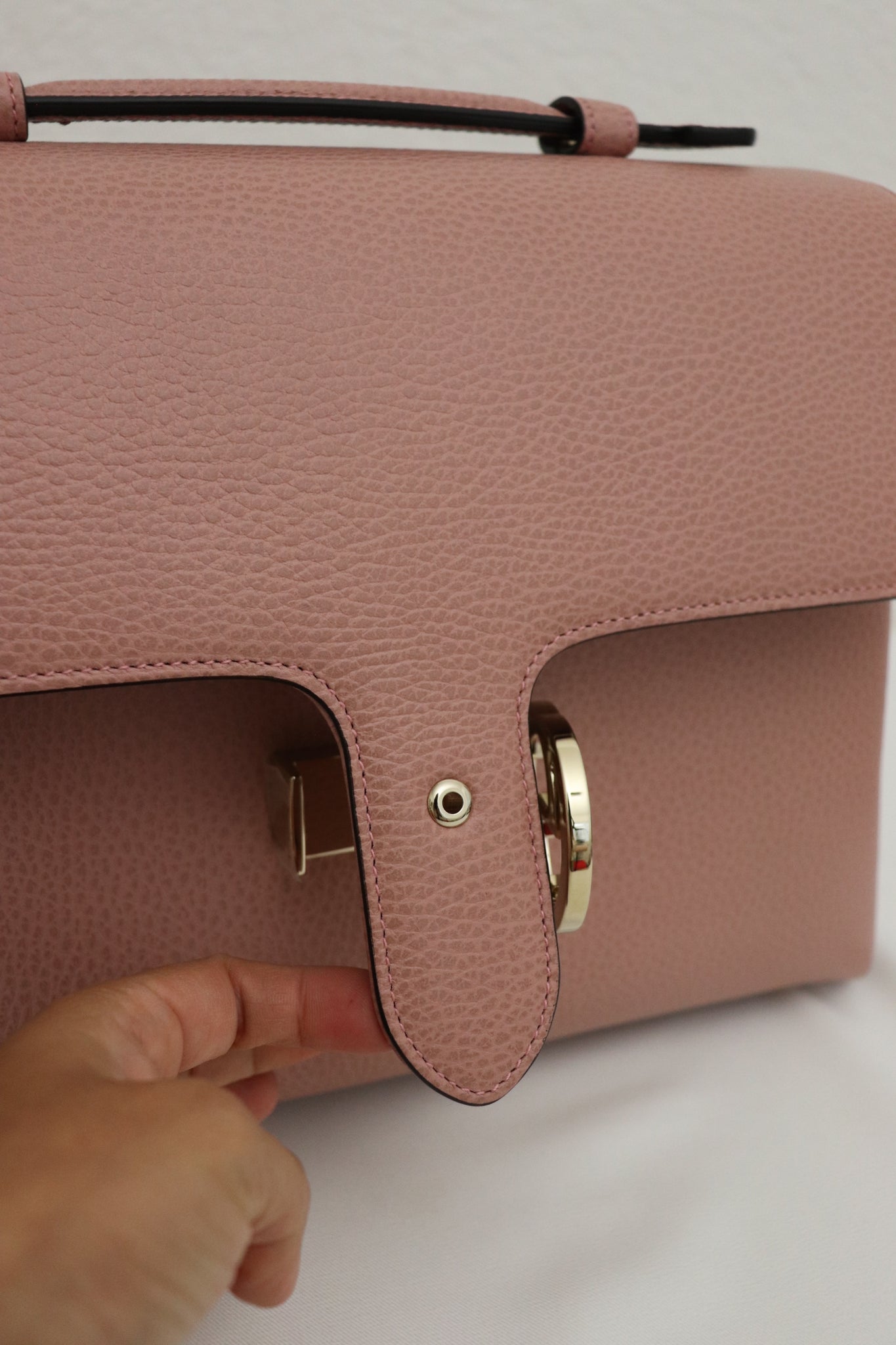 GUCCI Dollar Calfskin Interlocking G Top Handle Shoulder Bag in Soft Pink. This chic shoulder bag is crafted of grained calfskin leather in light pink. The bag has a waist-length shoulder strap and a facing flap with a polished silver interlocking G emblem. The flap opens to a partitioned natural fabric interior with zipper and patch pockets. Retails for $1699