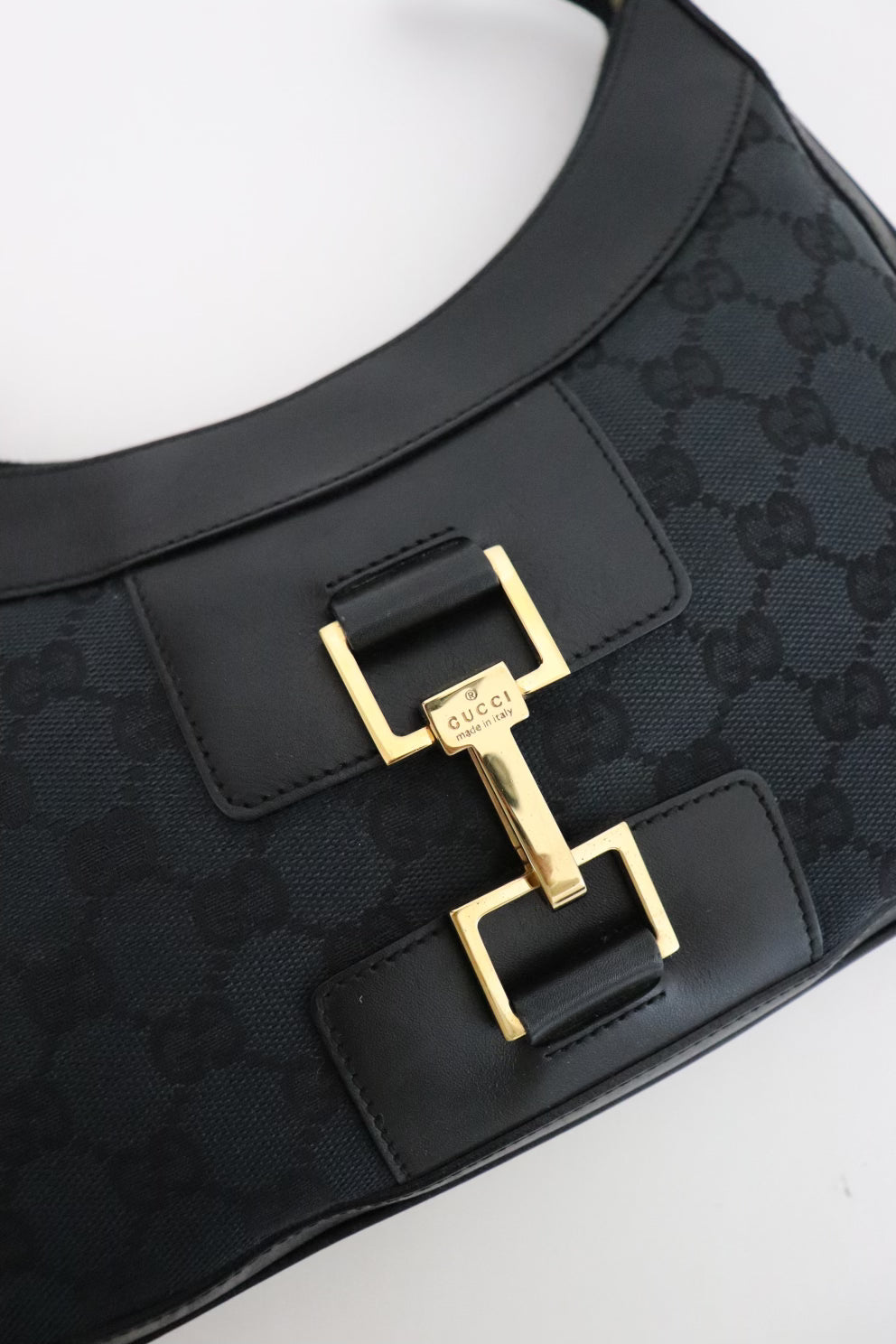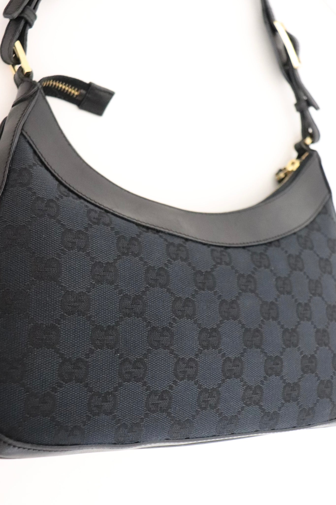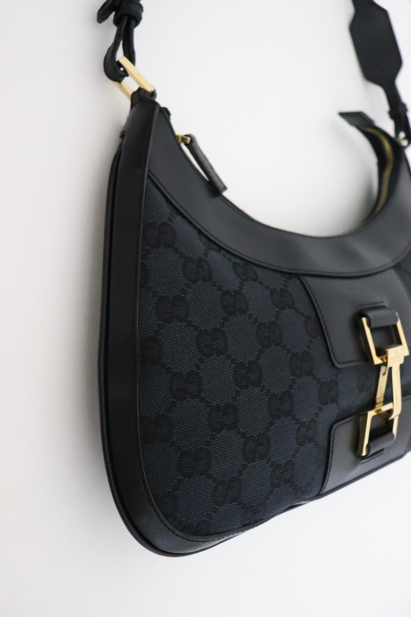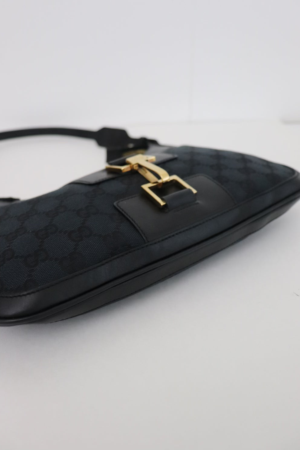 A timeless icon, reimagined. This sleek Gucci Jackie 1961 shoulder bag in black GG monogram canvas is the ultimate blend of vintage elegance and modern minimalism. Crafted with smooth black leather trim and finished with Gucci’s signature gold-tone piston lock, it’s a quiet luxury piece that speaks volumes.