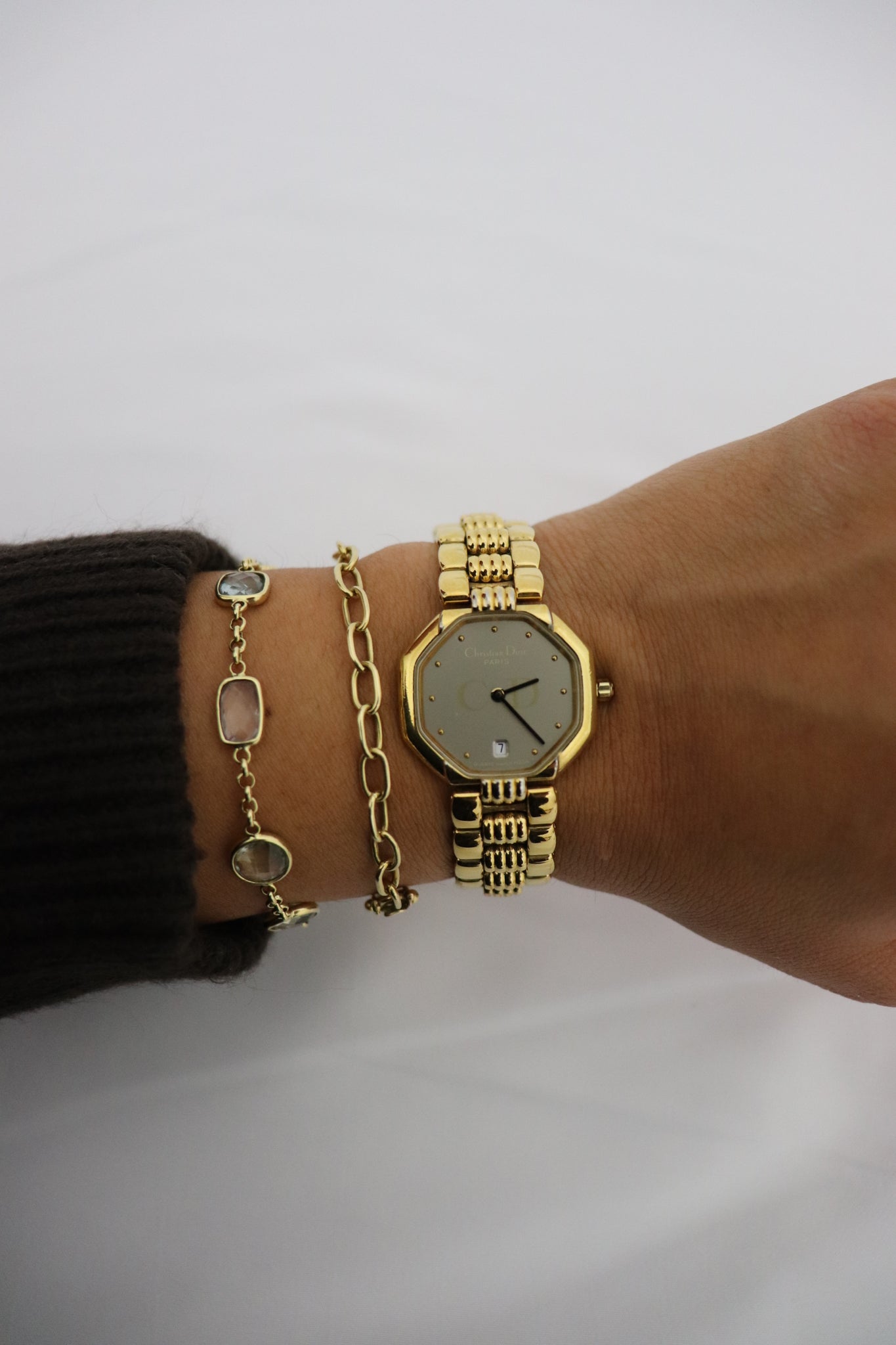Gorgeous 1990's Christian Dior Paris Model Depose Octagon watch with a silver/grey dial. This is a fully 18k gold plated watch band. Such a beautiful and unique piece. It is in great aesthetic condition, there are no marks or scratches on the face or band. There is a CD logo on the face and Christian Dior Paris etched on the back