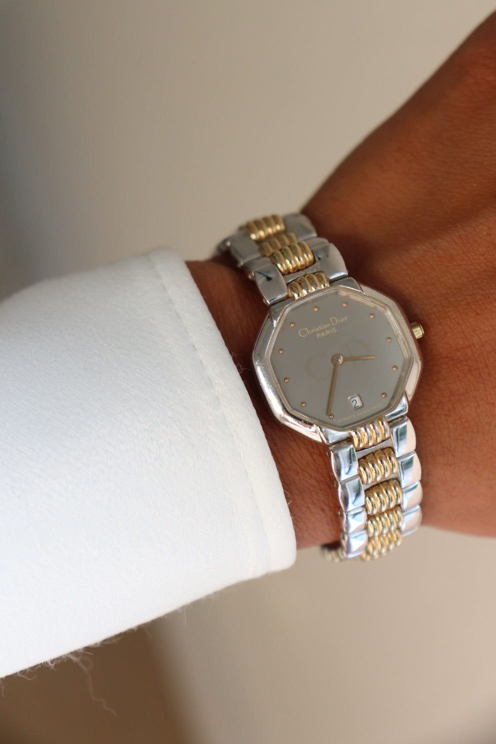 This rare vintage Dior watch stuns with its striking octagonal case, radiant silver tone dial with a bracelet. Making it feel more like a statement cuff than a classic timepiece. A true collector’s piece for those who don’t do ordinary.