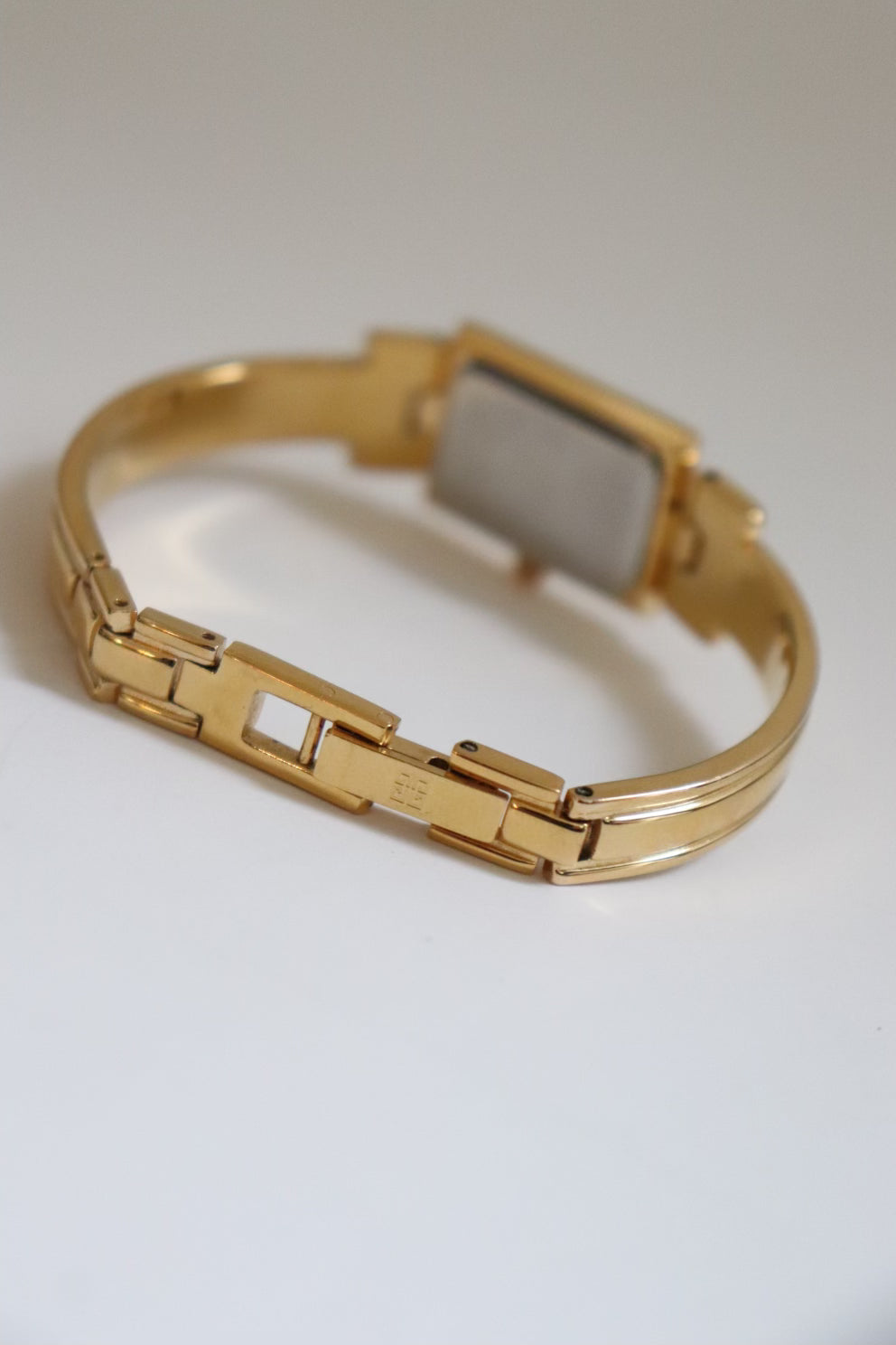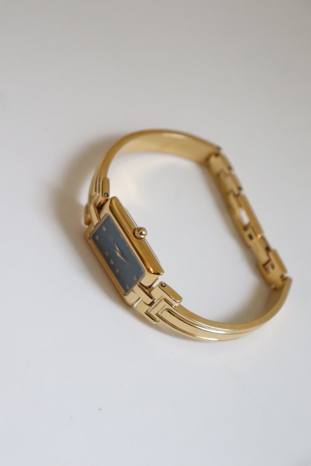 This striking 1990s Givenchy watch features a rectangular emerald dial adorned with two diamond accents at 12 and 6 o’clock. Set in a gold-plated case with a bold bangle-style bracelet, it blends the refinement of jewelry with the practicality of a timepiece. Finished with a quartz movement and signature Givenchy style—chic, timeless, and unmistakably Givenchy